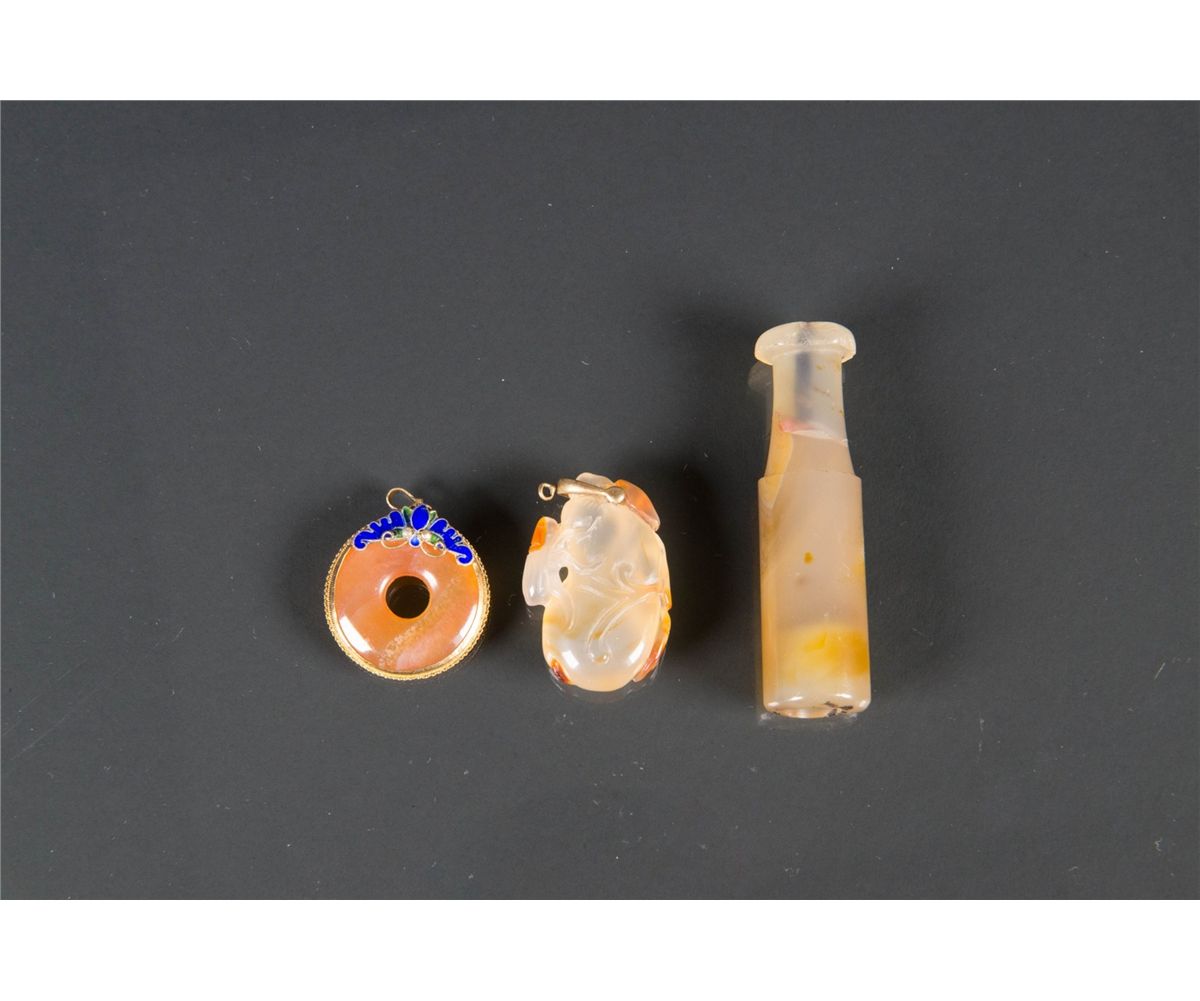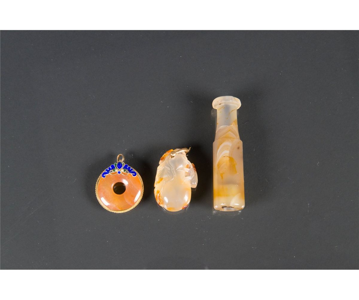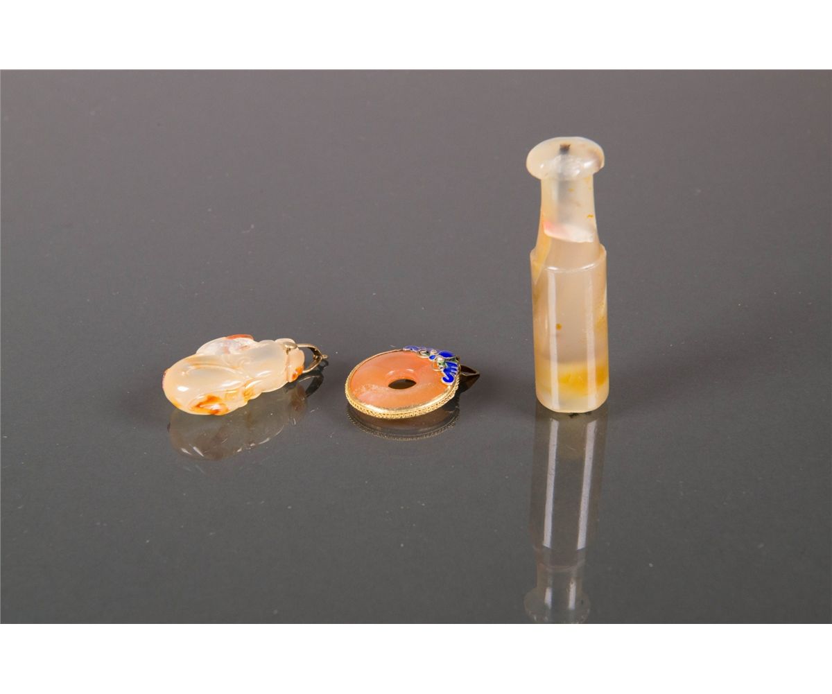 Pair of agate carved pendants and cigarette holder; H: 6.5 cm, D: 1.75 cm, 55 grams (cigarette holder); D: 3 cm, 7 grams (bi disc); L: 4 cm, 13 grams (gourd)