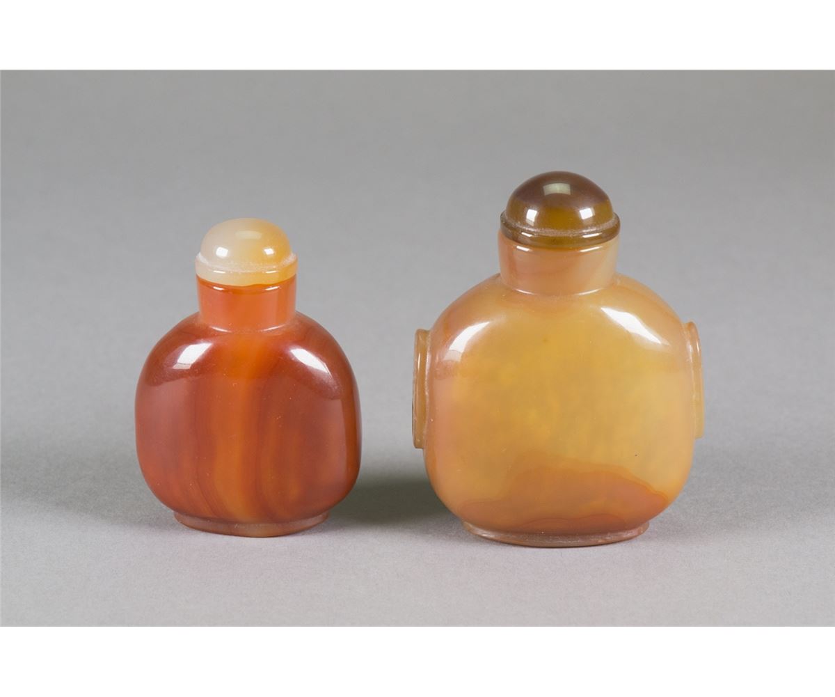Two pieces of snuff bottles; of round body; uncarved surface; of red orange and light brown tone; H: 8.5 cm, W: 7 cm, 184 grams both