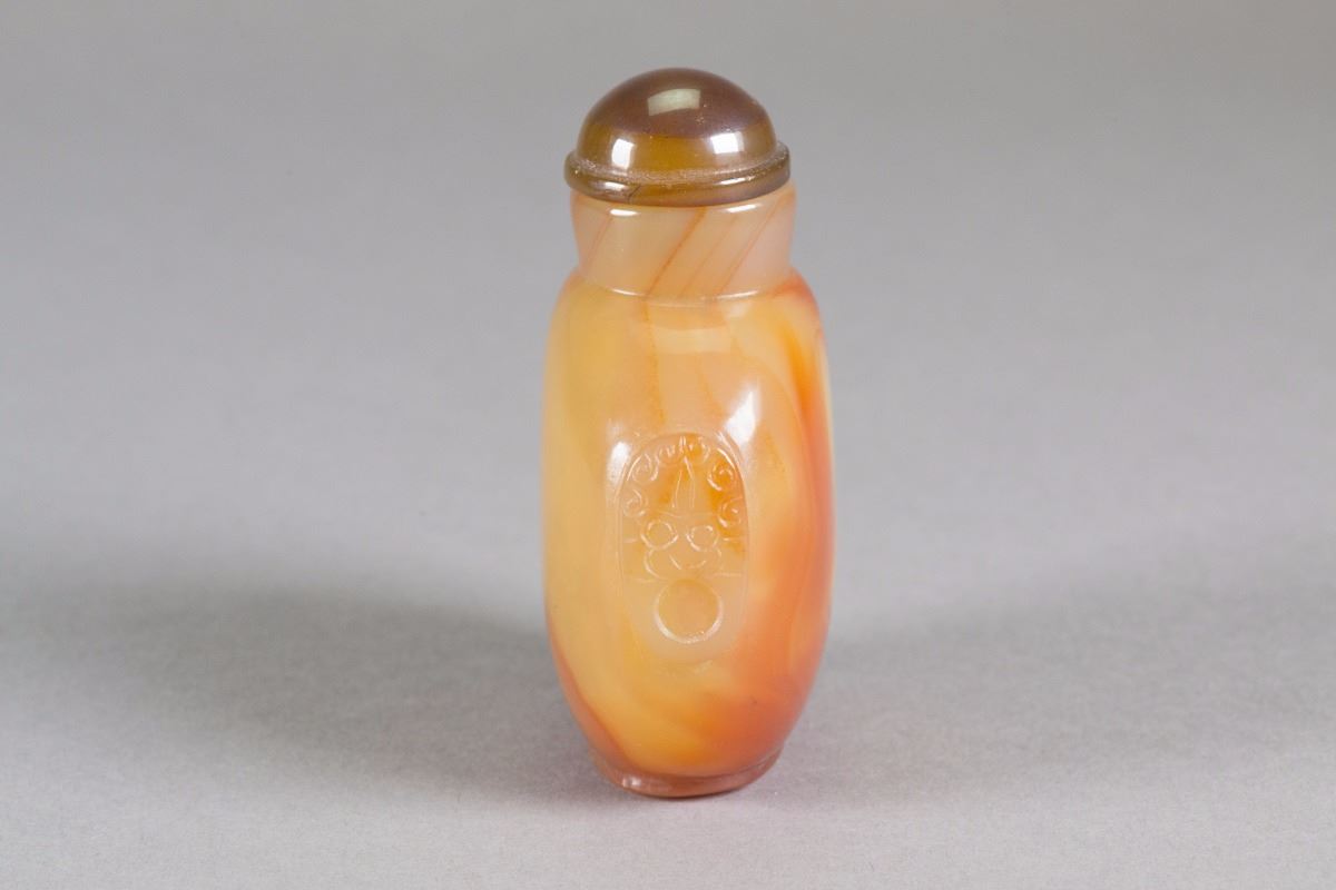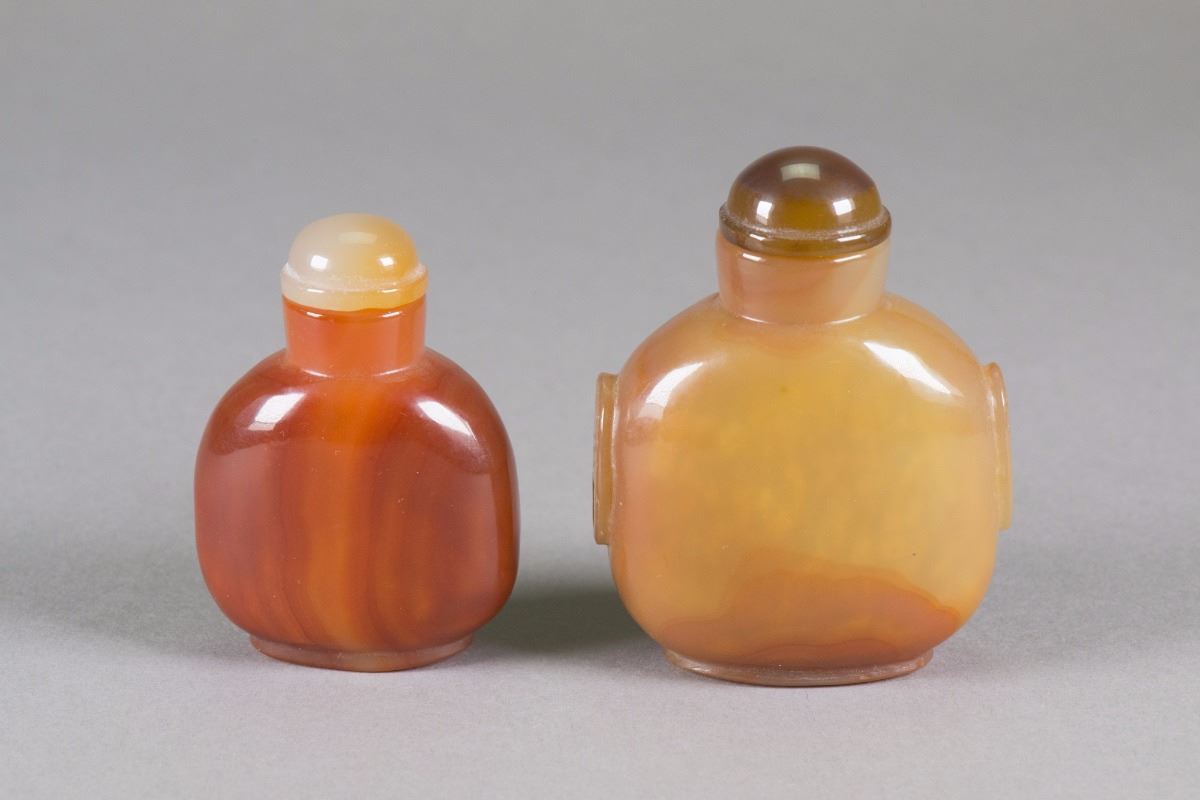 Two pieces of snuff bottles; of round body; uncarved surface; of red orange and light brown tone; H: 8.5 cm, W: 7 cm, 184 grams both