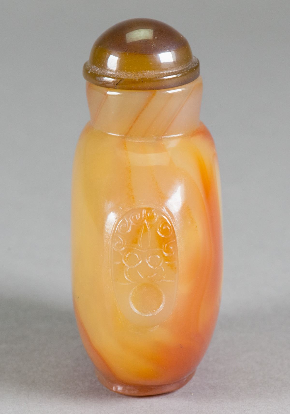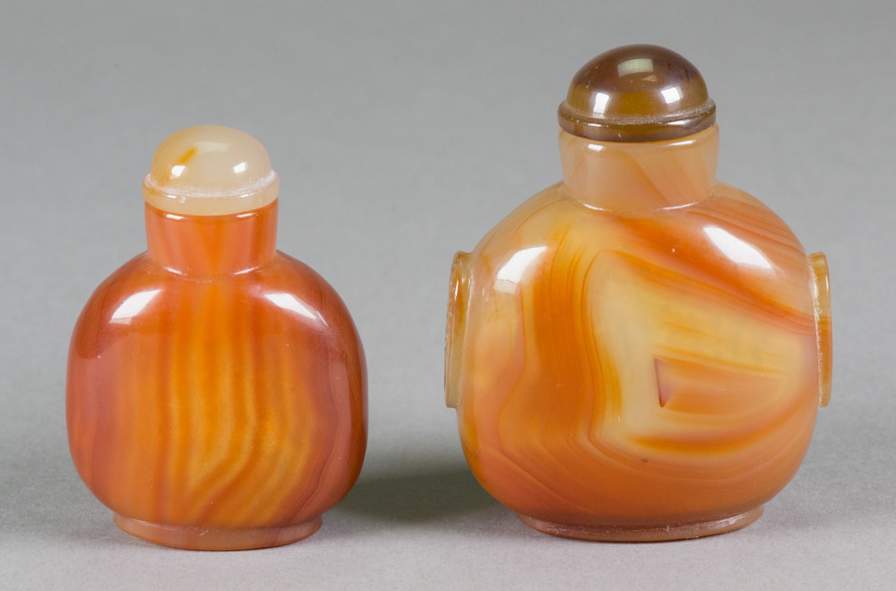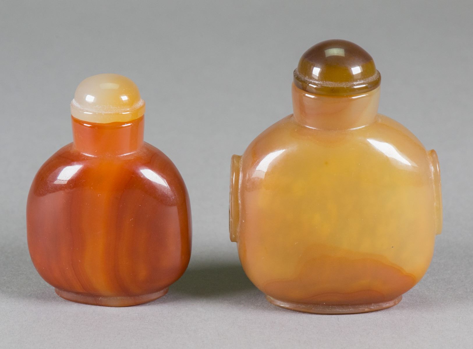 Two (2) pieces of snuff bottles; of round body; uncarved surface; of red orange and light brown tone; H: 8.5 cm, W: 7 cm, 184 grams both