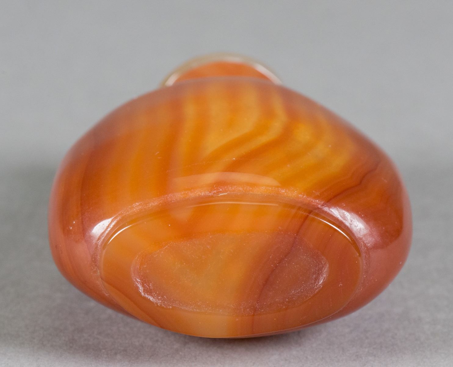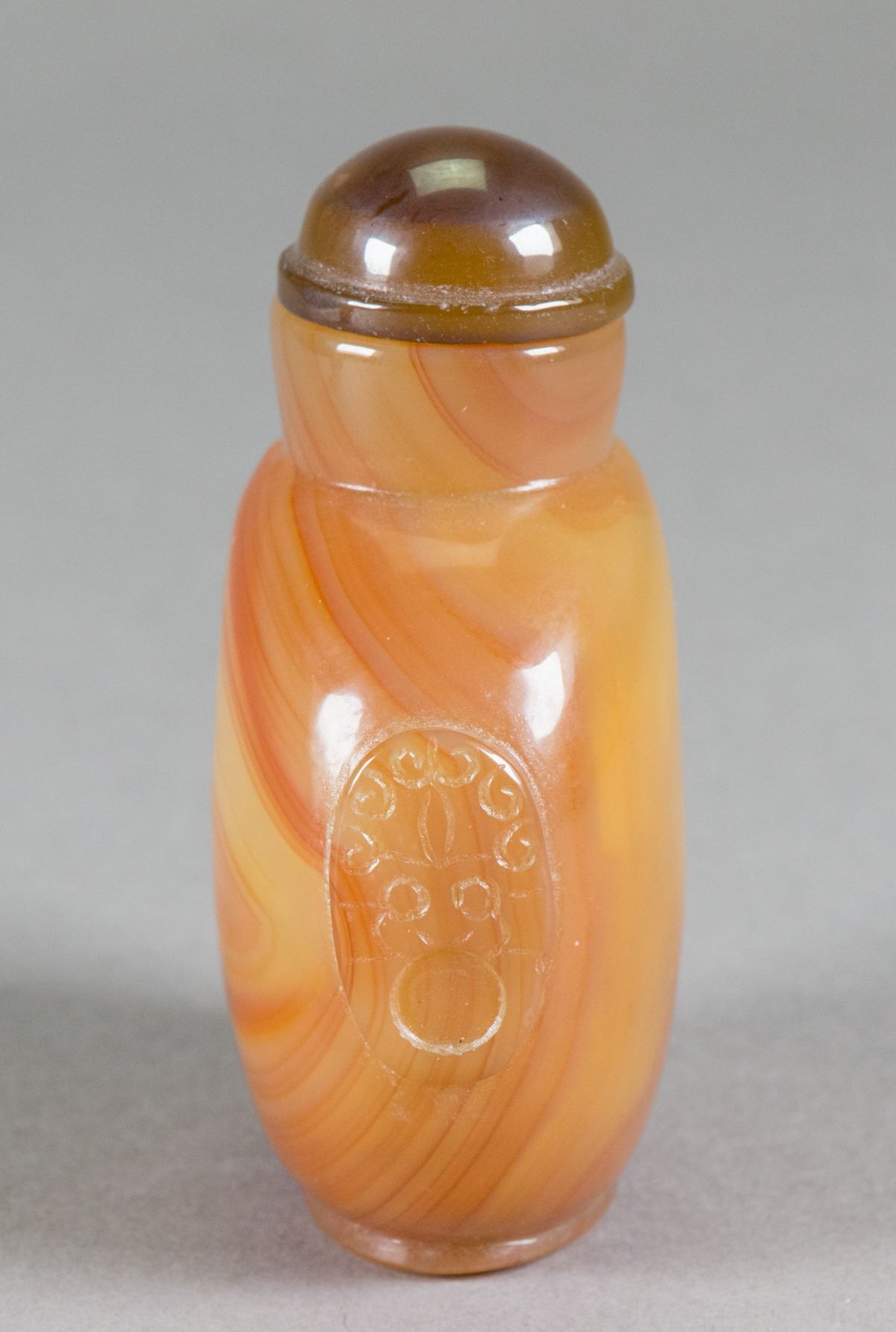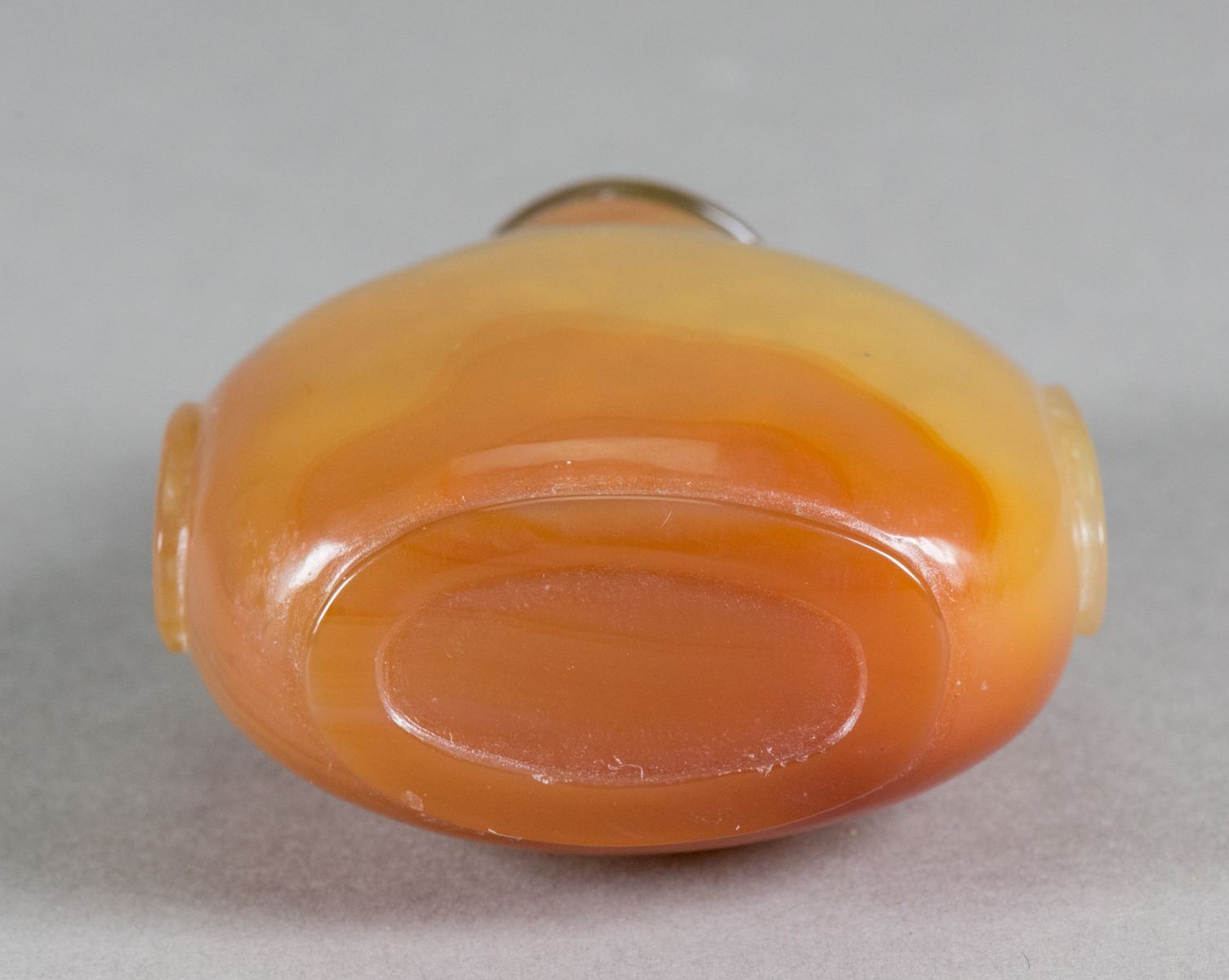 Two (2) pieces of snuff bottles; of round body; uncarved surface; of red orange and light brown tone; H: 8.5 cm, W: 7 cm, 184 grams both