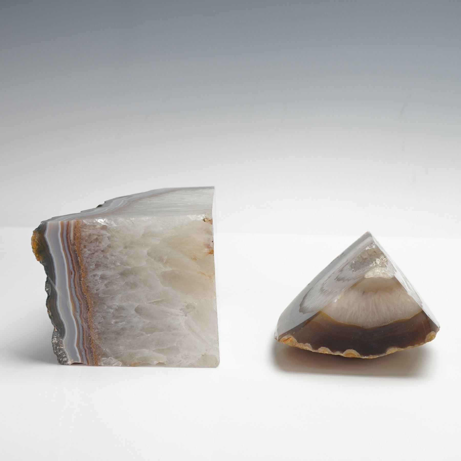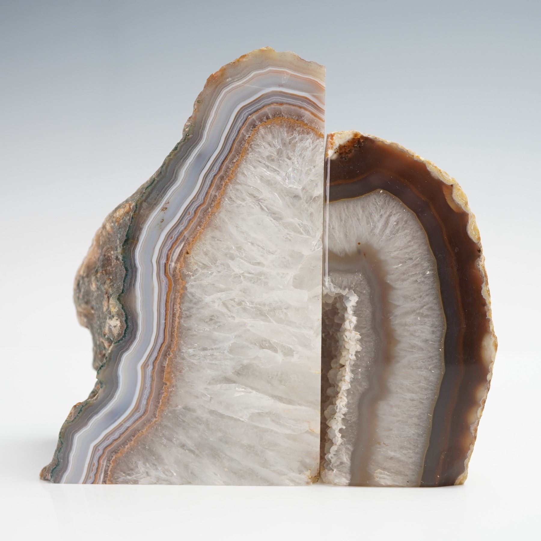 Natural stone, featuring agate with geode centers. The agate sides display vivid, layered patterns, while the geode side reveals a crystalline interior, adding natural texture and beauty. A striking pair for any collection or decor.