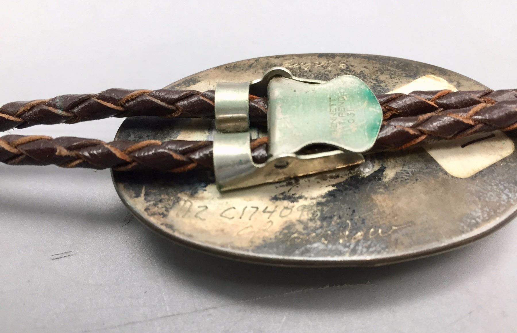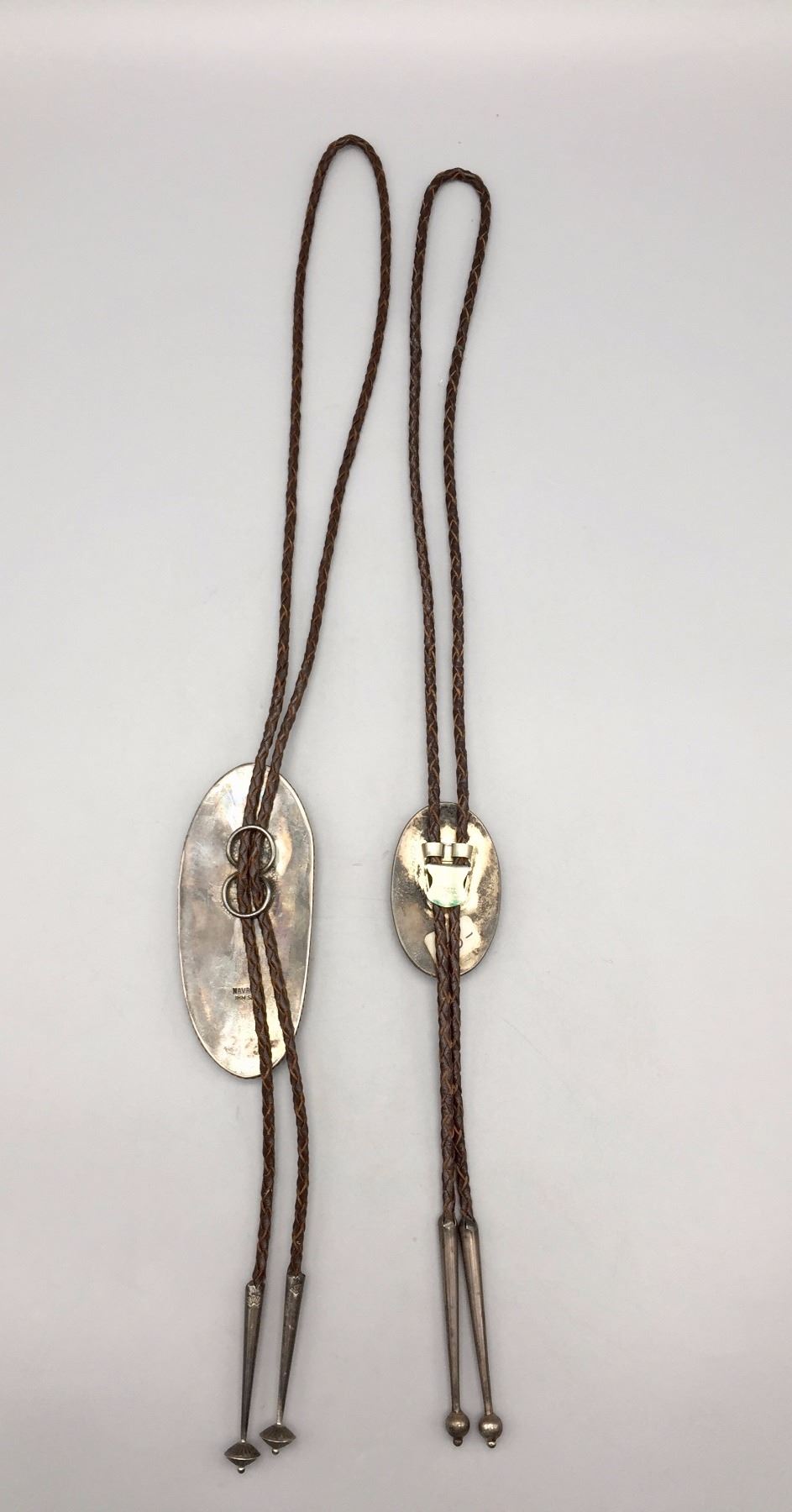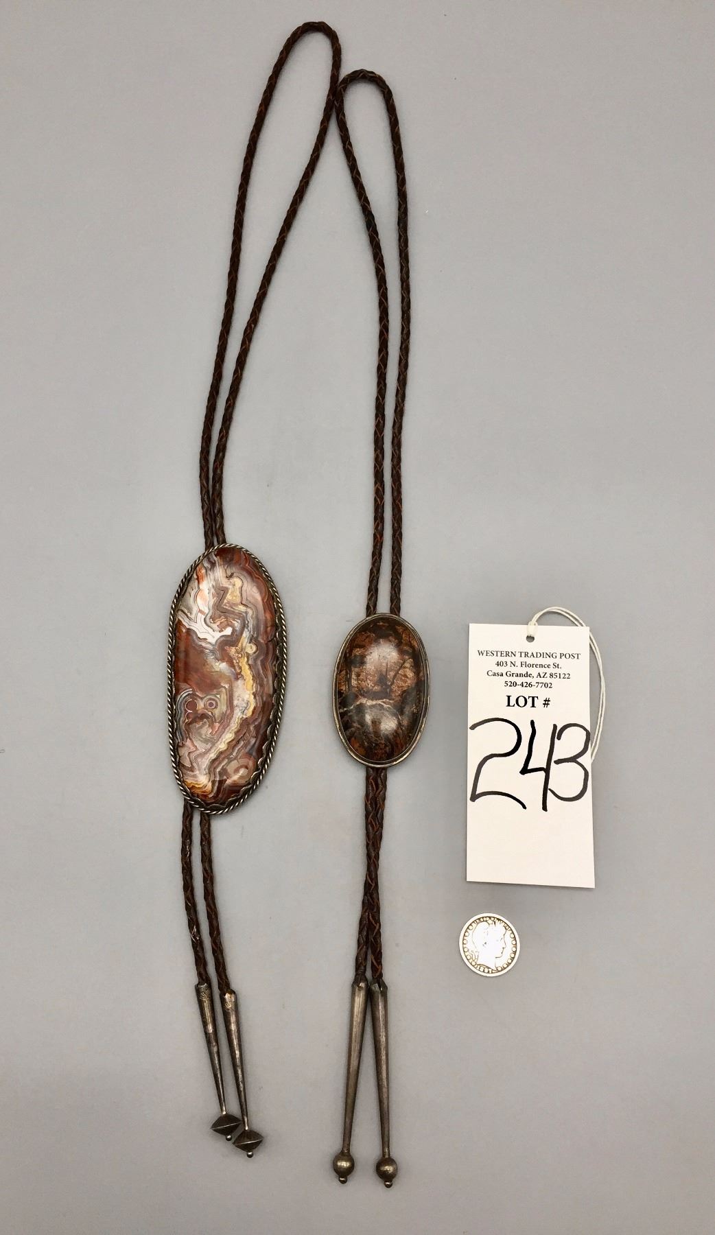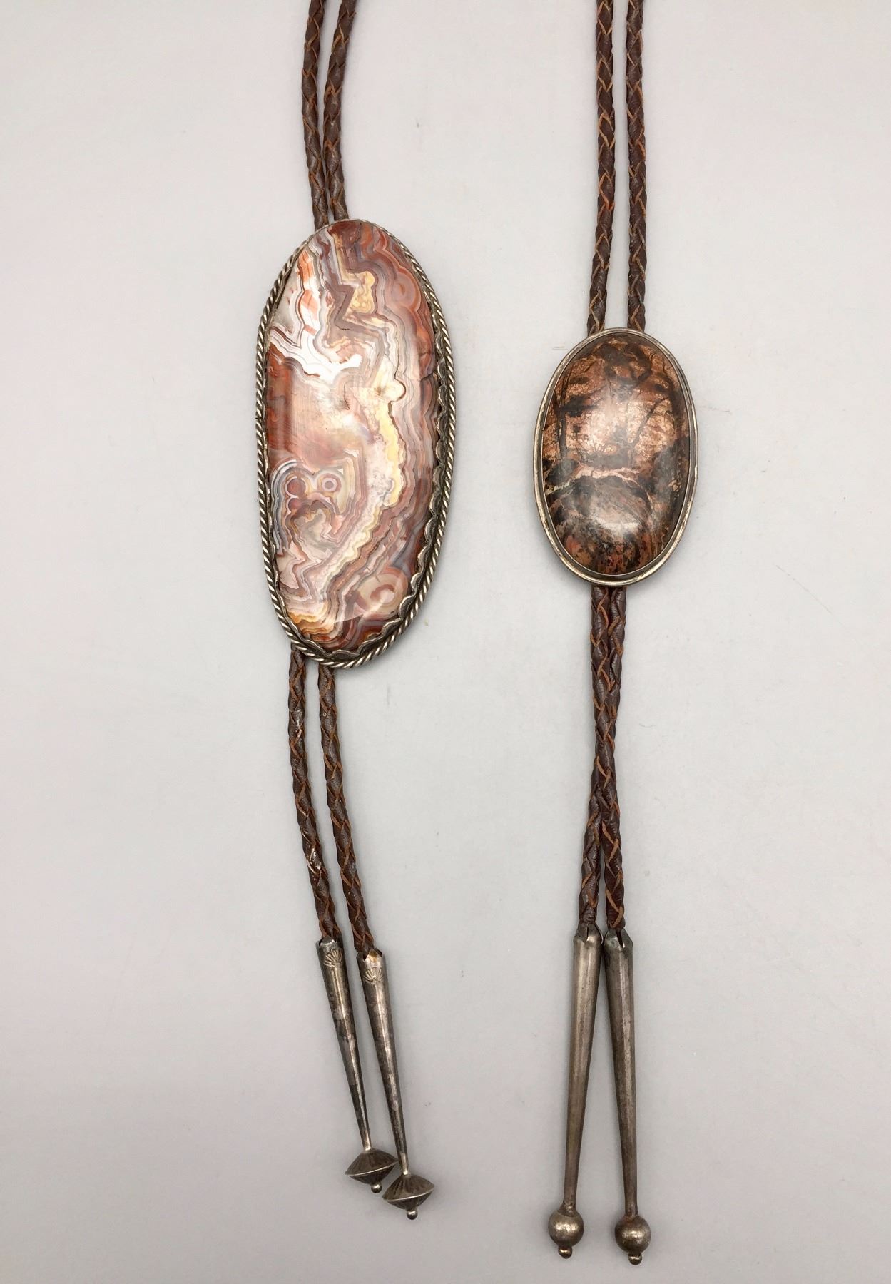 Description: Pair of large agate and sterling silver bolos. Maker: Various. Approx. Age: 1970s. Size: 38” around the neck and slide is 2 /5/8” l x 1 1/2” w. 40” around the neck and slide is 4 1/2” l x 2” w. Combined weight of 192. 7 g. Condition: Good for their age, normal wear expected. Please look closely at the pictures - they are an important part of our description. Shipping: There will be a $5 handling / packaging fee for shipping this lot. The actual cost of postage will be added on top of that.