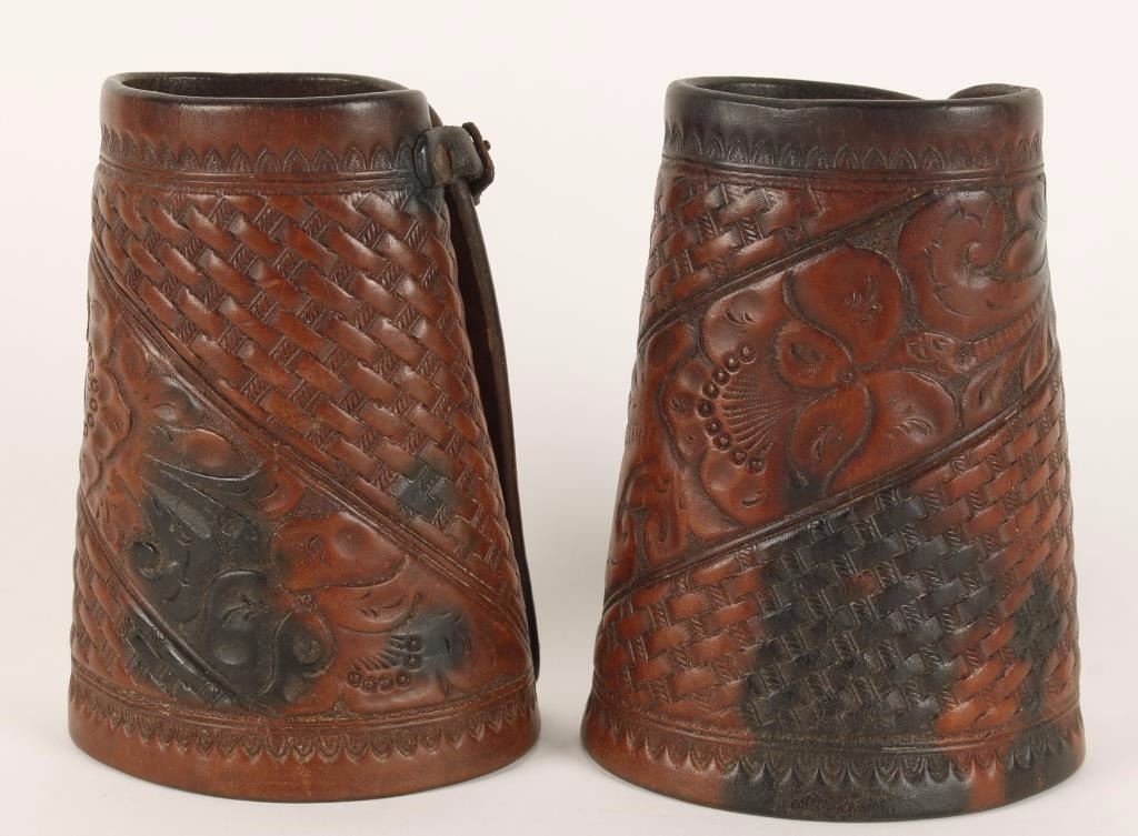 Brown leather construction which is floral and basketweave tooled. Maker marked. Leather has some dark spotting in scattered areas.