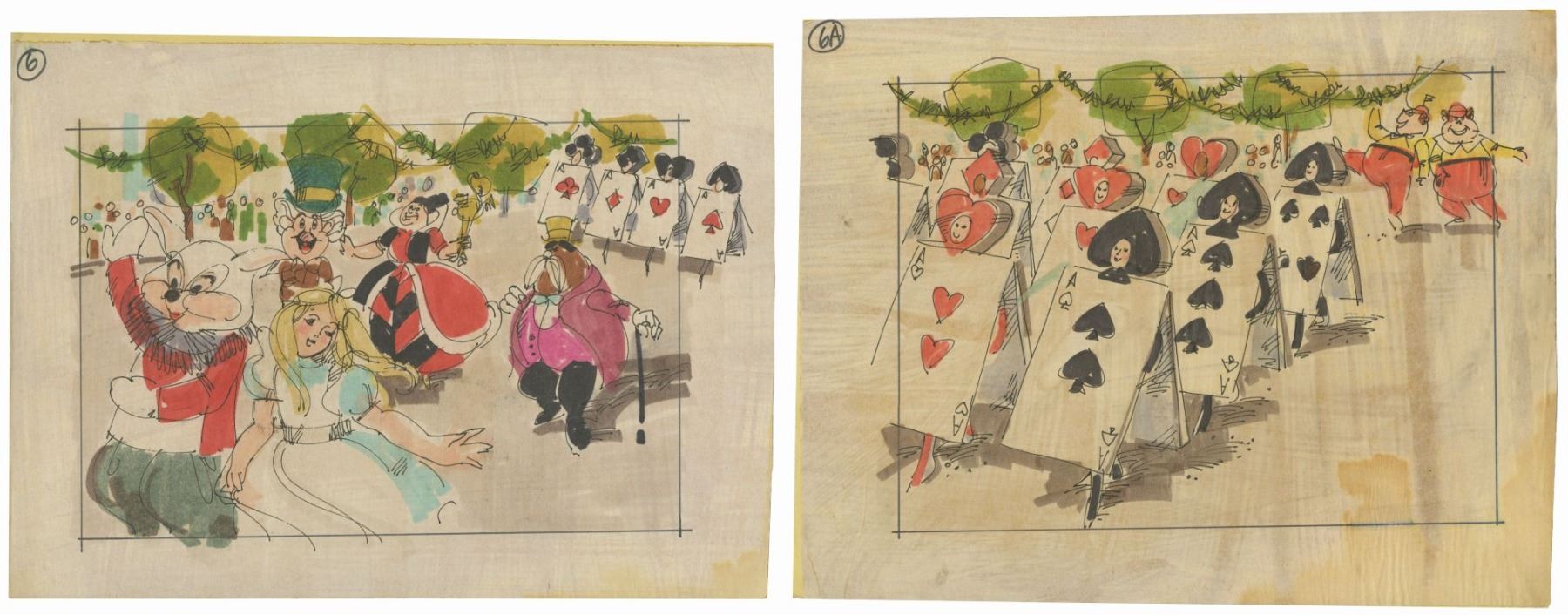 (Disneyland, c.1980s) A pair of original concept illustrations by Imagineer Lee Story for a Disneyland parade featuring Alice in Wonderland characters. Accomplished in ink and marker on thin vellum that is adhered to art board, these illustrations wonderfully capture the feeling of a Disneyland parade. The drawings measure approximately 9"x12" each, and the condition is fair to good overall with some moisture discoloration in the lower-right corners.