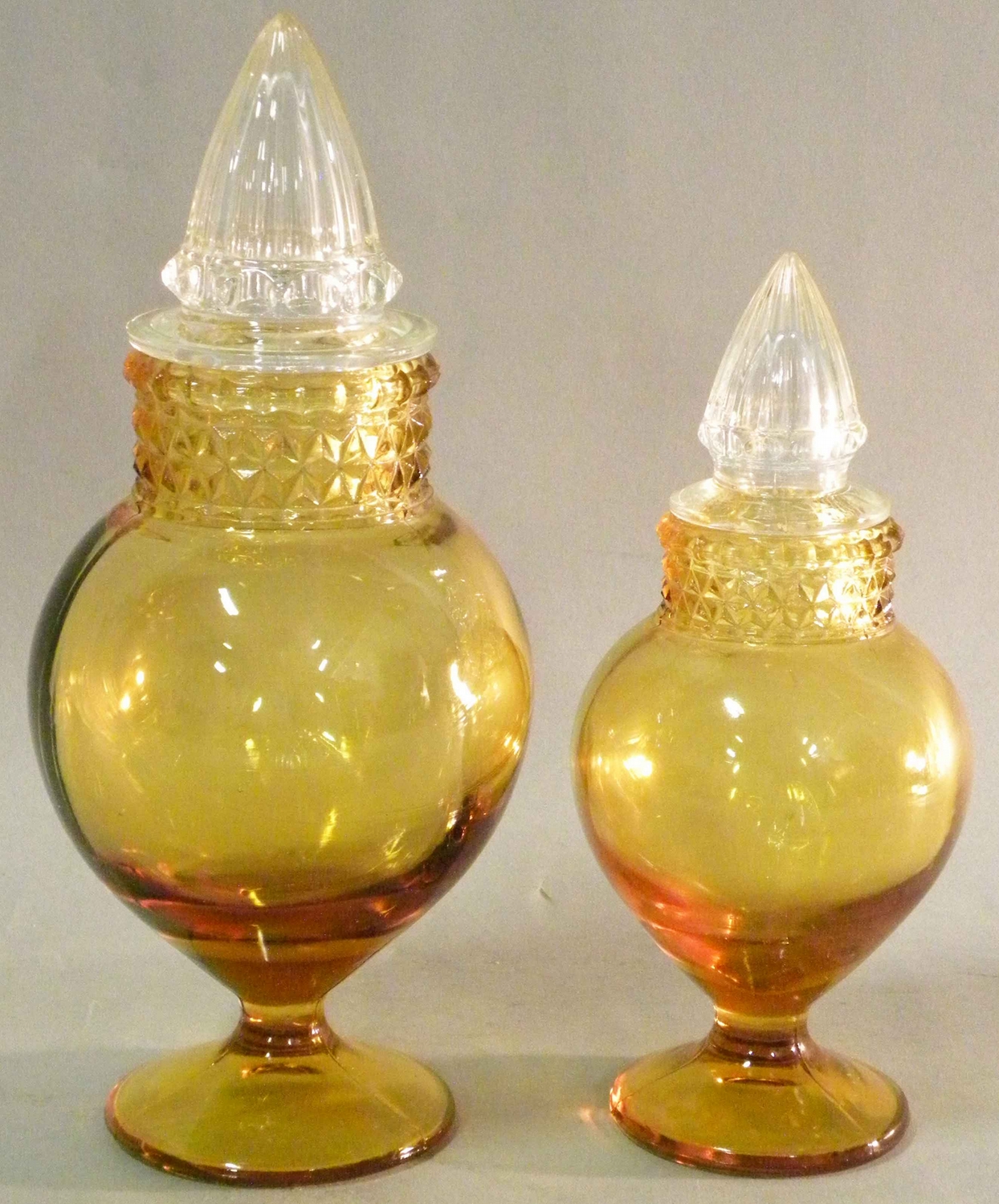 Pair of Amber Candy Jars. Jars have clear lids, no chips or cracks. 11 & 9 inches tall.