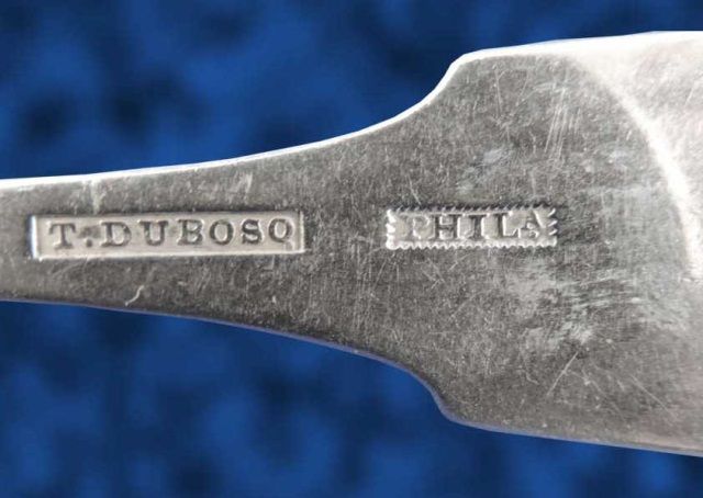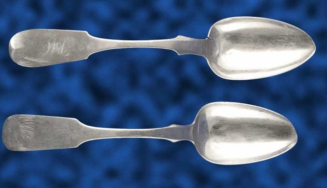 both 9 inches in length: A) Spoon signed Theo. Dubosq Philadelphia 1829-1850; B) Spoons signed R&W Wilson, Philadelphia 1825 1840, both rare.
