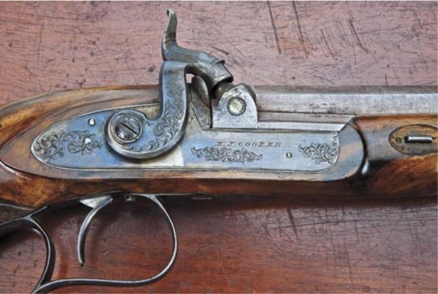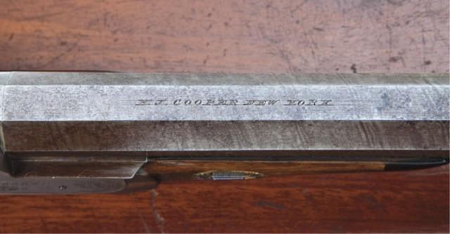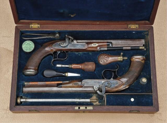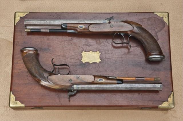 Pair of American dueling/target pistols by H. J. Cooper, New York. .45 caliber smoothbore, medium weight octagon barrels, half-stocked, striped and brown barrels, case hardened locks, blued triggerguards, select walnut checkered stocks, with adjustable set triggers. The pistols measure approx. 15-3/4” overall, with 9” barrels. In their original to the period recess-styled case. The stocks show alterations at top from saw handle, whereas the top portion reduced and a silver plaque inlaid in each top area and the work appears to be done during the period, probably by the maker. Our theory is that the buyer didn’t care for the saw-handle and the maker or a period gunsmith carefully and professionally customized them to the customer’s order. The work is expertly done during the 19th century. The barrels retain 50-70% original browned finish with most of their striping, some scattered erosion and pinprick pitting. The locks show 80% plus original case hardening with some very colorful rainbow areas. The locks are nicely engraved as are the tangs and the breeches show a gold band. One hammer spur is broken off. The stocks are very good showing a select walnut with crisp checkering, some minor