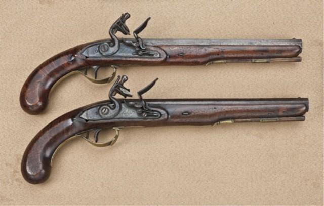 Pair of American flintlock “Kentucky” style pistols by Tryon of Philadelphia with Ketland & Co imported locks. The pair measure 16-3/8” overall, with 10-1/4” barrels of approx. .52 caliber smooth bore. The pair are full stocked to the muzzles and are simply mounted in plain brass with light engraving and the stocks show some nice striping at the wrist. The metal surfaces are in good condition showing light to moderate pitting and erosion. One barrel shows some light cleaning, some slightly heavier pitting around the firing areas of the breech and one pistol shows many small marks on the top of the barrel which extend about two inches. The pistol with the marks on the barrel is in its original flintlock configuration with correct hammer, frizzen, small parts other than top jaw and screw which are old replacements. The stock shows some small losses around the rear of the lock and there has been some wood repair and replacement of wood on the area in front of the lock extending approx. 1”. The top edge of the stock extending forward about one inch. The top edge of the stock where it meets the barrel and about 6” back are replaced wood. The butt shows some marks, and there are some marks around the