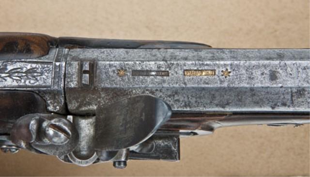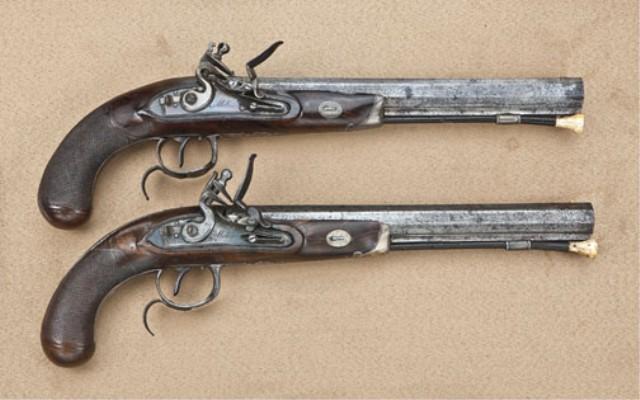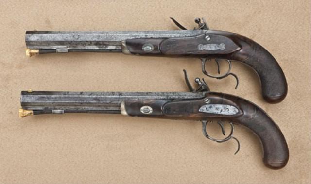 Pair of American flintlock dueling pistols signed Miles, Philadelphia. The pair measure 16” overall with 10-1/2” barrels of approx. .62 caliber smoothbore. Half stocked in high quality walnut with checkered butts, spurred iron guards, silver forend caps and escutcheons, set triggers, gold inlaid maker’s name and proofs, and gold plated front sights. The pair show a v-notch type sight at each breech area. The pistols have been professionally reconverted to flintlock and one pistol has been badly broken at the wrist and shows an old iron strap type repair at the wrist and left side of stock. Both stocks show extensive wood repairs. The metal surfaces show some pitting and erosion. The pair retain original to the period bone/ivory tipped ramrods. Pistols by this scarce Philadelphia maker are rarely encountered and as a point of interest John Miles contracted with the state of Virginia for 250 pistols in about 1801 making him one of the earliest American makers. From the William R. Orbelo Collection. Est: $7,500 - $15,000