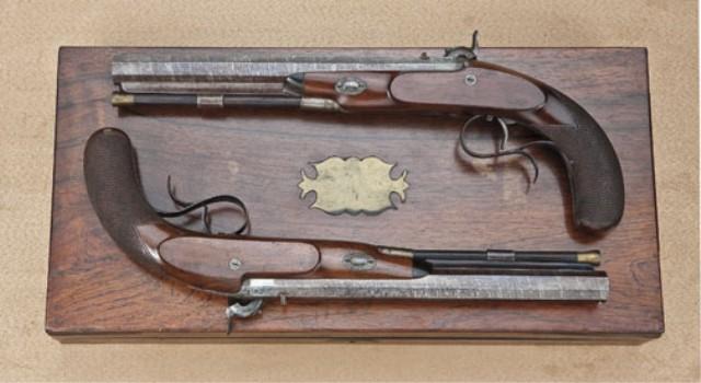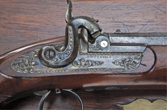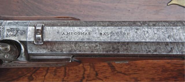 Pair of American percussion target/dueling pistols signed “A. McComas, Baltimore”. The pair are approx. .50 caliber smoothbore with 10” medium to slightly heavy weight octagon barrels, 15-1/2” overall, half stocked. The pistols show well-made V-notch rear sight, bead front sight, adjustable set trigger, the pair show 50-70% original brown lightening stripped barrels drifting to grey with some slight erosion and staining, just beginning pinprick pitting. The locks and hammer show 80-90 original case hardening just toning and graying, going to a natural patina. The triggerguards show 75-85% bright original bright blue finish, the stocks are sharp and are well checkered and show a select grain walnut and most of their original varnish, at least 90%. Some minor scratches and storage marks. The pair show horn forend caps, original to the period brass tipped ramrods, the actions are crisp, the pistols are very good plus overall. The pair are contained within their original to the period French style recessed case lined in rose colored cotton velveteen. The box shows some wear at the contact points and edges, some minor fading, normal aging, but generally the interior is very good. An original to the case