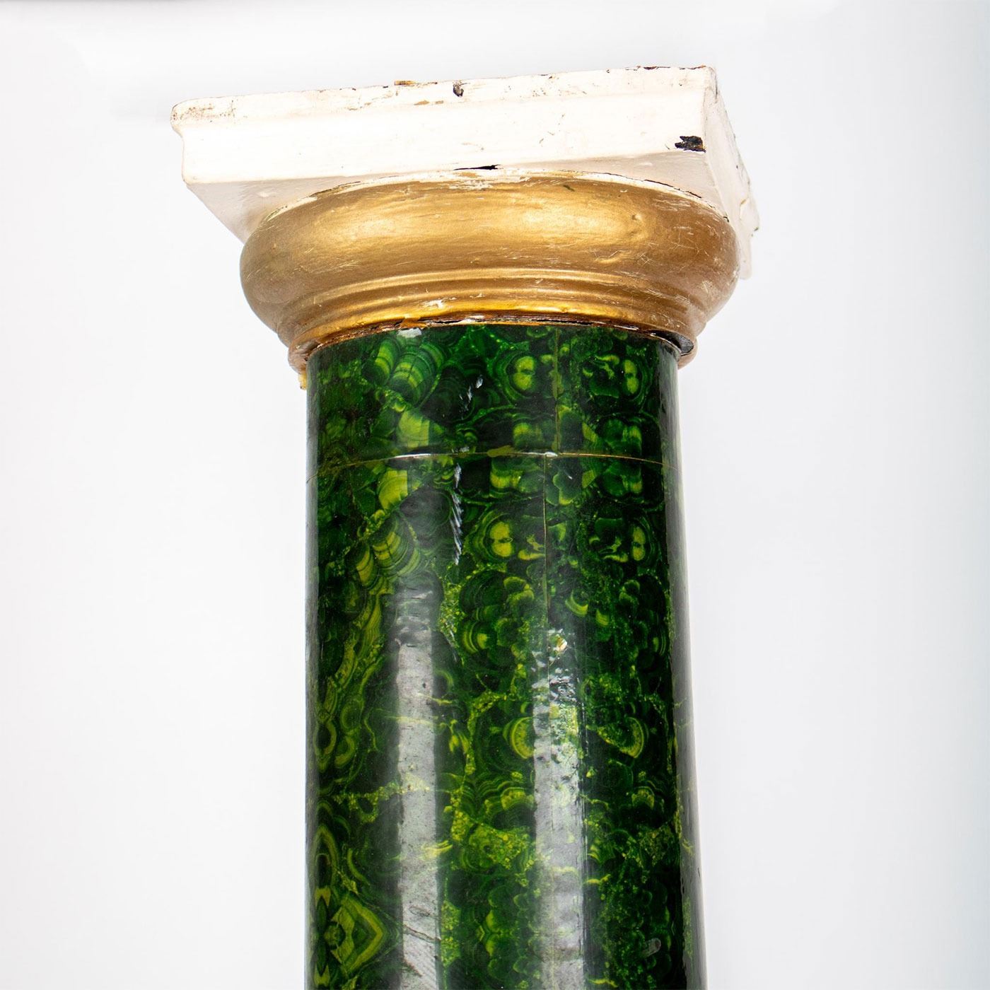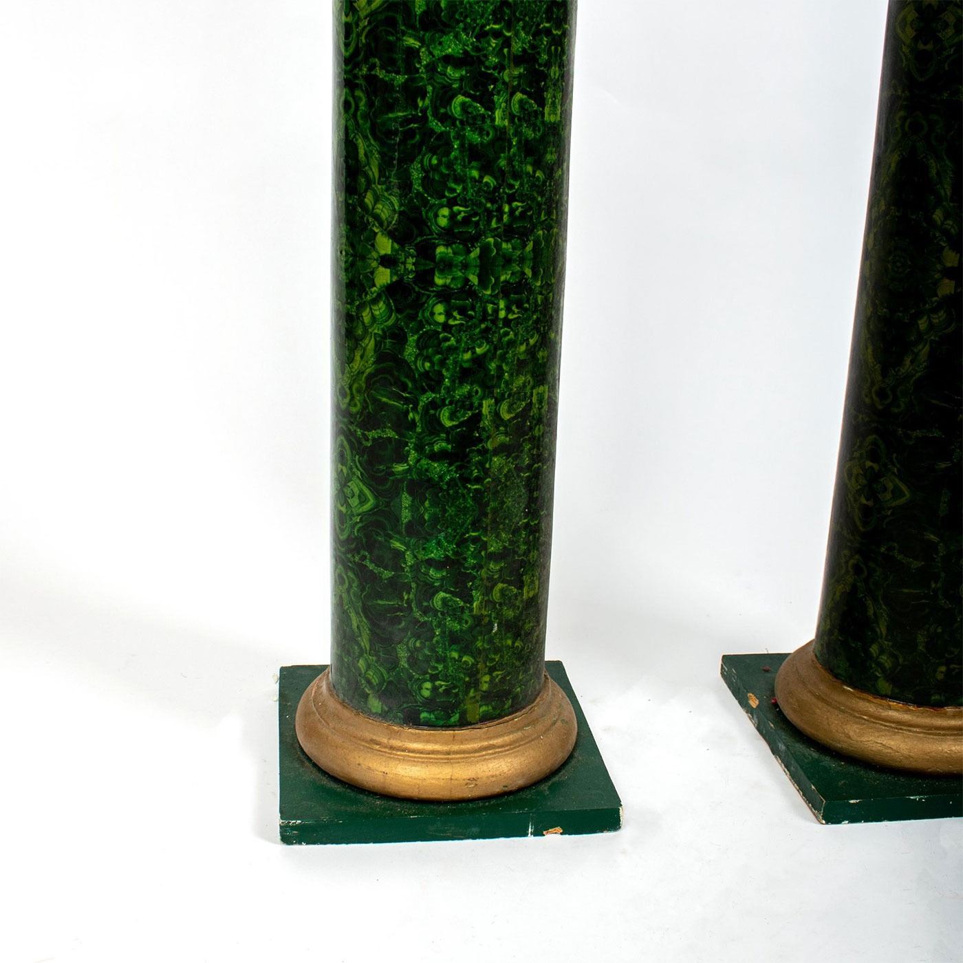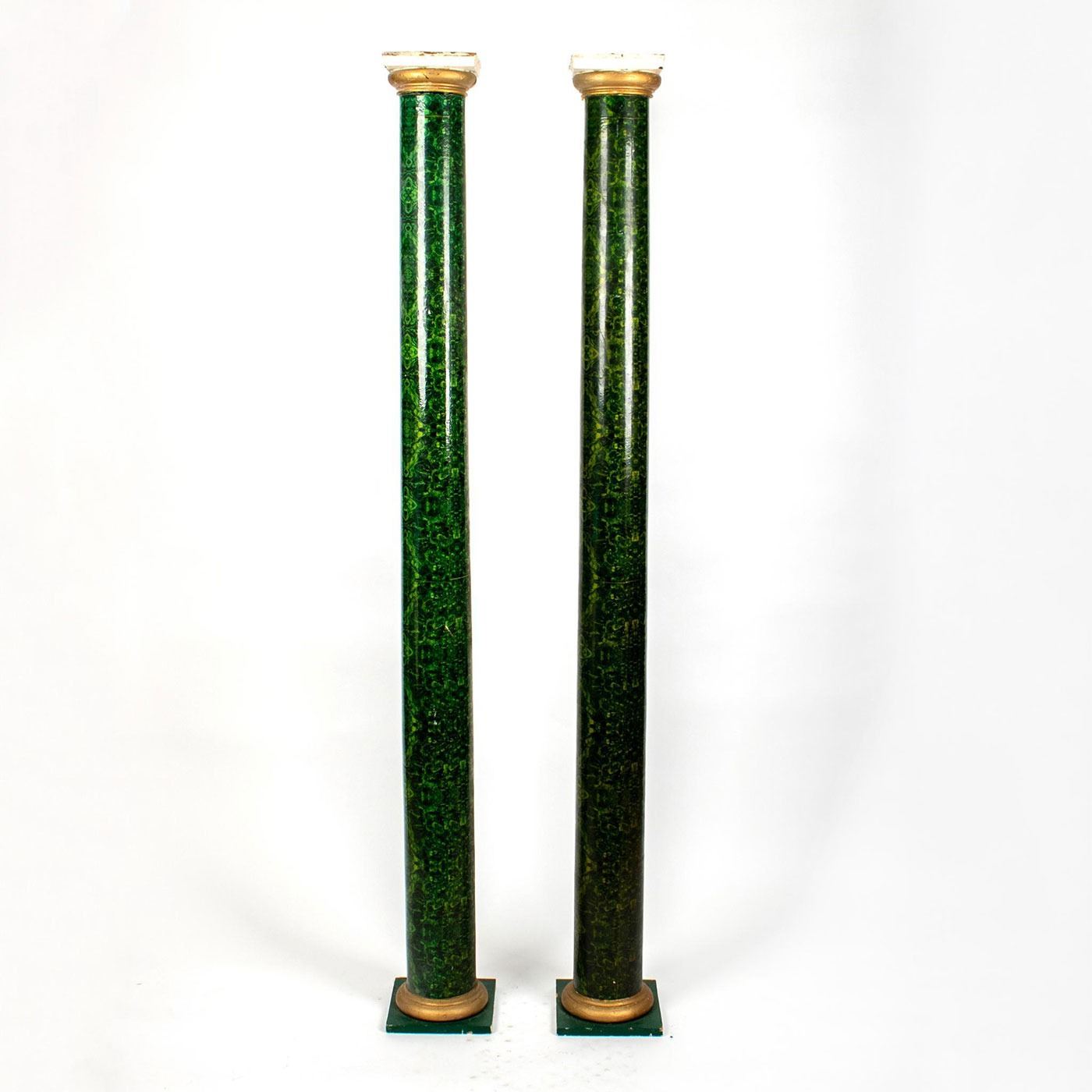 Wrapped in dark green stylized coloration. Carved wood, hand painted bases with accents of gold gilt.