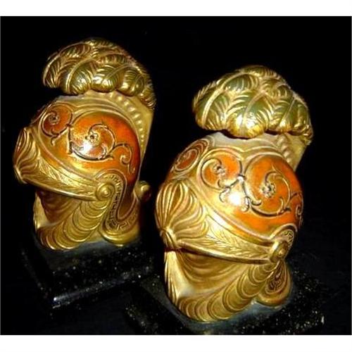 Soldiers' helmets on faux marble bases. In mint condition. Hand-painted on wood. A wonderful addition to any library.