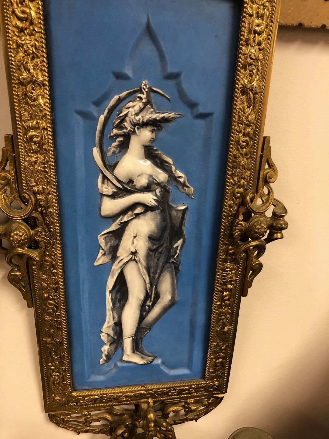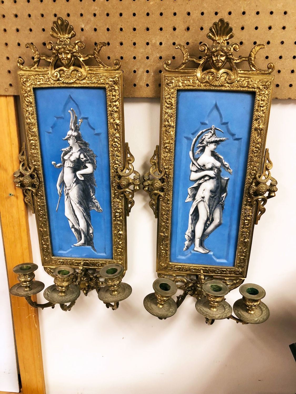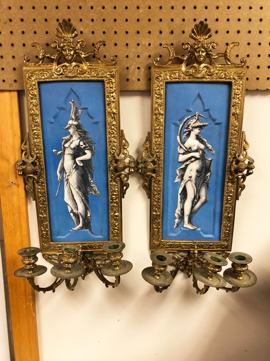Very unusual pair of antique candle sconces with porcelain panels in 3 dimension, with warriors signed on back, with gold gilt. 3 candle holder on each of sconces. Marked on back Montereau, LM & C. The LM & C marked was used by Leboeuf, Millet and Co. of Crell and Montereau, France. We have never seen these before, very rare!