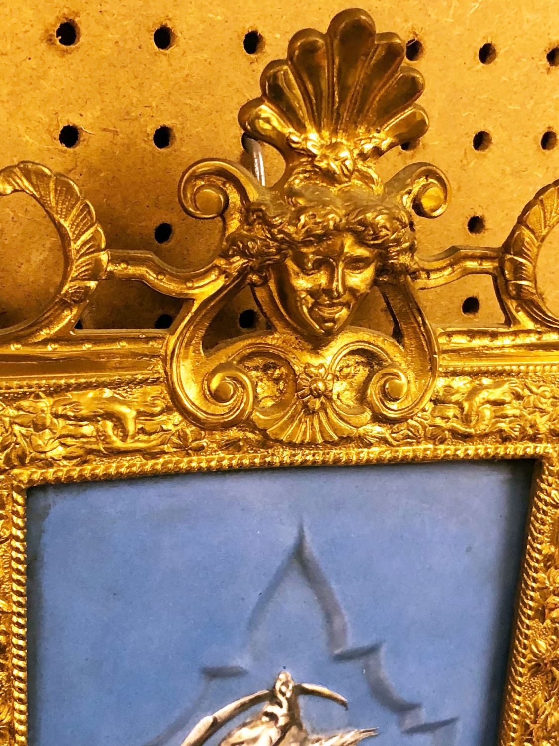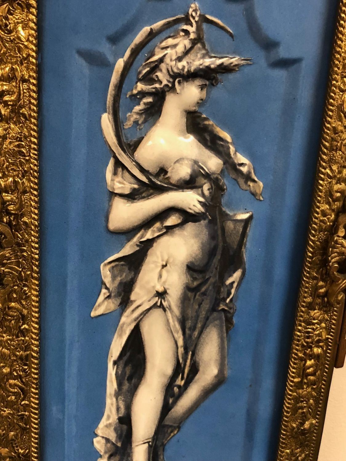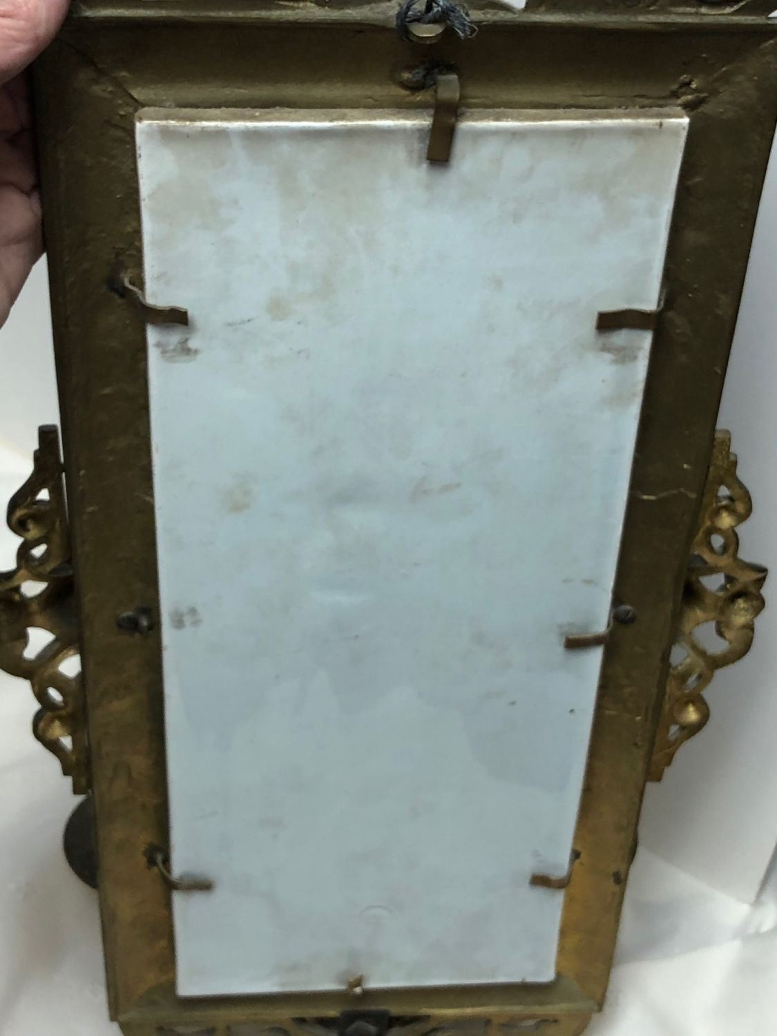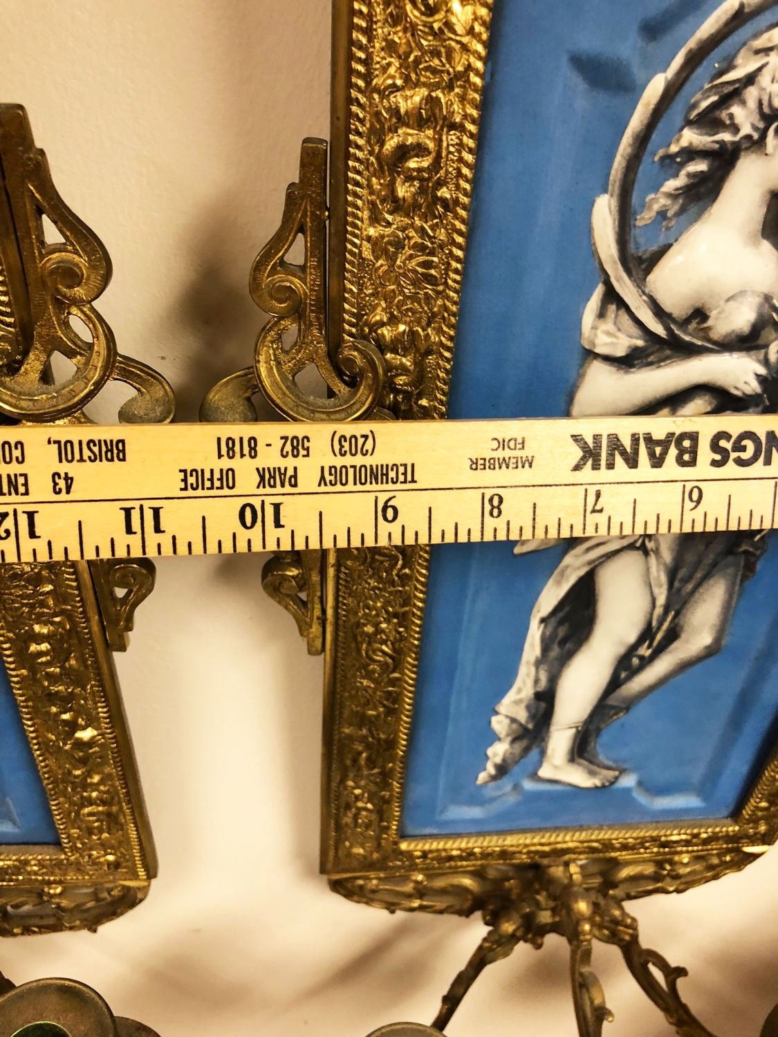 Very unusual pair of antique candle sconces with porcelain panels in 3 dimension, with warriors signed on back, with gold gilt. 3 candle holder on each of sconces. Marked on back Montereau, LM & C. The LM & C marked was used by Leboeuf, Millet and Co. of Crell and Montereau, France. We have never seen these before, very rare!