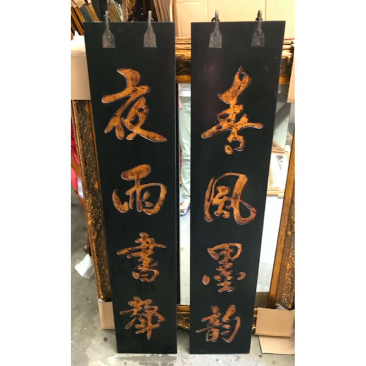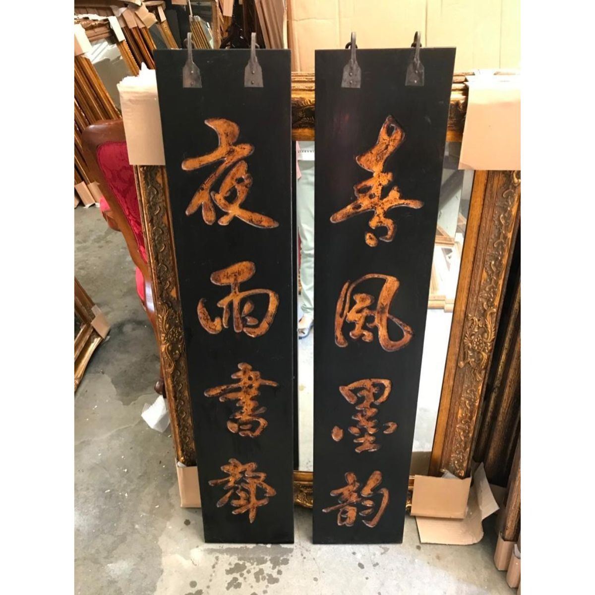 Pair of Antique Chinese Character Portrait wall panels with iron hangers. 9 1/2" W X 47" H. * due to size & weight of panels, special pick up/ delivery shipping arrangements are required.