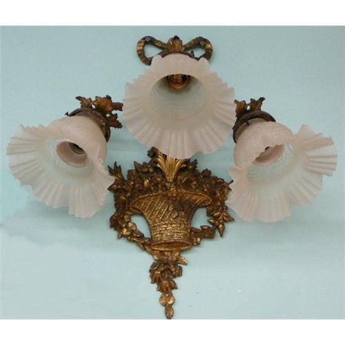 This is a fabulous unique pair of antique French dore' bronze sconces in the form of flower baskets. They have three lights each with frosted glass shades and are wired for USA use.