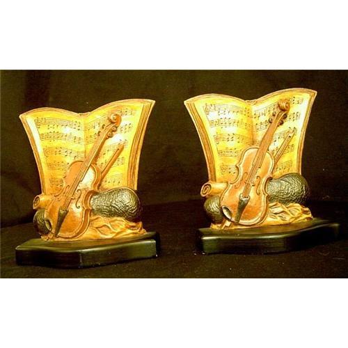 For the music lover!  Rare and usual pair of antique bookends depicting a violin sitting on an open book of sheet music.  Wood composite.  All expertly executed.  In very good condition.