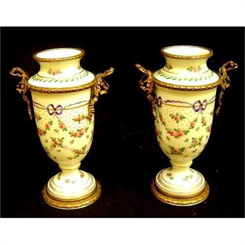 The condition, design and execution of this pair of small vases is absolutely superb! Hallmarked. There is no question of their authenticity. Porcelain, adorned with pink roses and blue ribbons. Handles of dore bronze "ribbons", as well. All in pristine condition. For the serious collector.