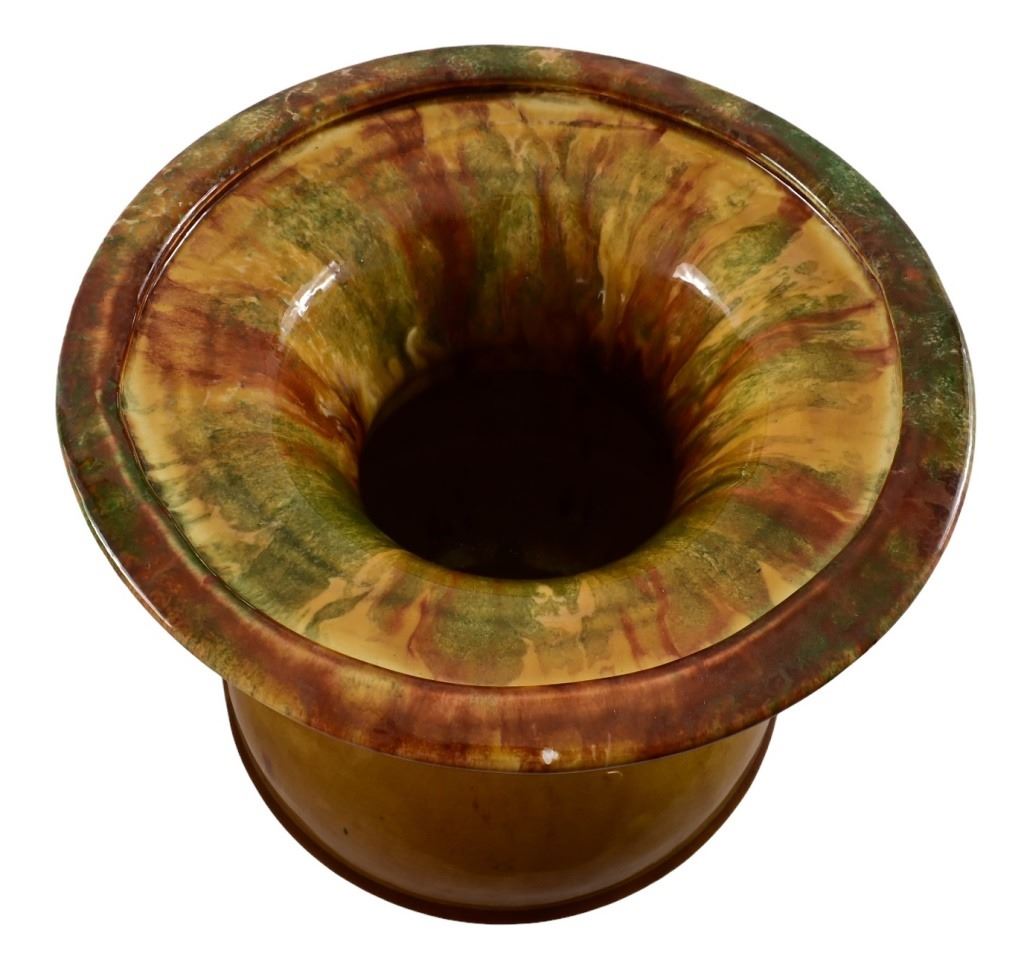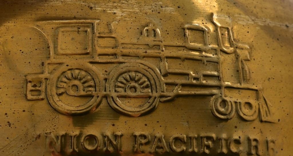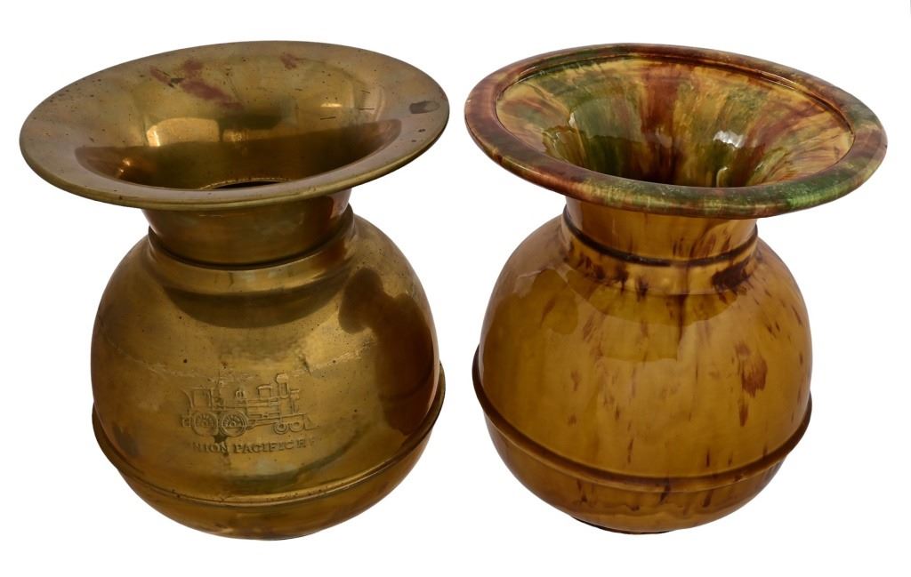 Brass spittoon marked Union Pacific Railroad, Ceramic glazed spittoon is unmarked. Both measure 8.75" x 10"