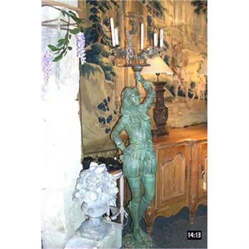 This is a pair of antique torcheres with a verdegres finish from France. The materials are bronze and mixed metals, and the condition is good. The "tray" which is being held by one statue is missing two candleholders, but we have them. They must be re-welded. These are beautiful for an interior or exterior design. Please contact for more pictures or information. Thank you--Le Louvre Antiques