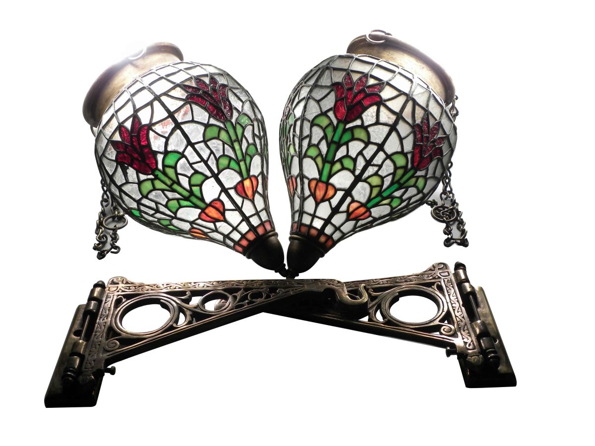 Pair of Apothecary Leaded Glass Globes with original brass brackets. A few cracked glass panels otherwise good condition. 9 1/2 inch diameter X 13 inches tall.