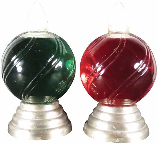 Pair of Apothecary Light Up Display Globes. One jar has chips in lip rim and minor interior chips on ground glass stopper. Overall very good condition.