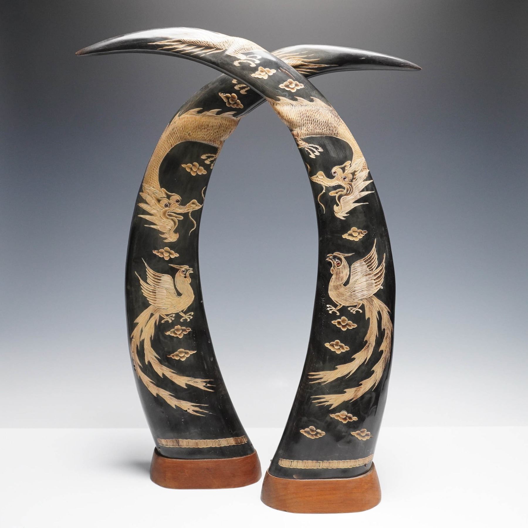 A striking pair of decorative horns; possibly buffalo horn. Each mounted on a wooden base and intricately carved with mythological motifs including dragons and phoenixes amidst stylized clouds. The opposing forms are arranged in a dynamic, arched display, with fine incised detailing that highlights the flowing feathers, scales, and expressive features of each figure.