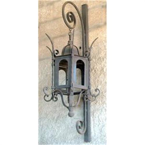 PAIR of Architectural wrought iron lanterns for outdoor use , wall mounted ,measuring without the mounting device 33 inches H and 15 inches wide.