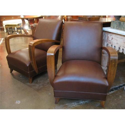 This gorgeous pair of armchairs has solid walnut armrests and new Argentine leather upholstery. The seat is firm yet comfortable and offers exceptional lumbar support.