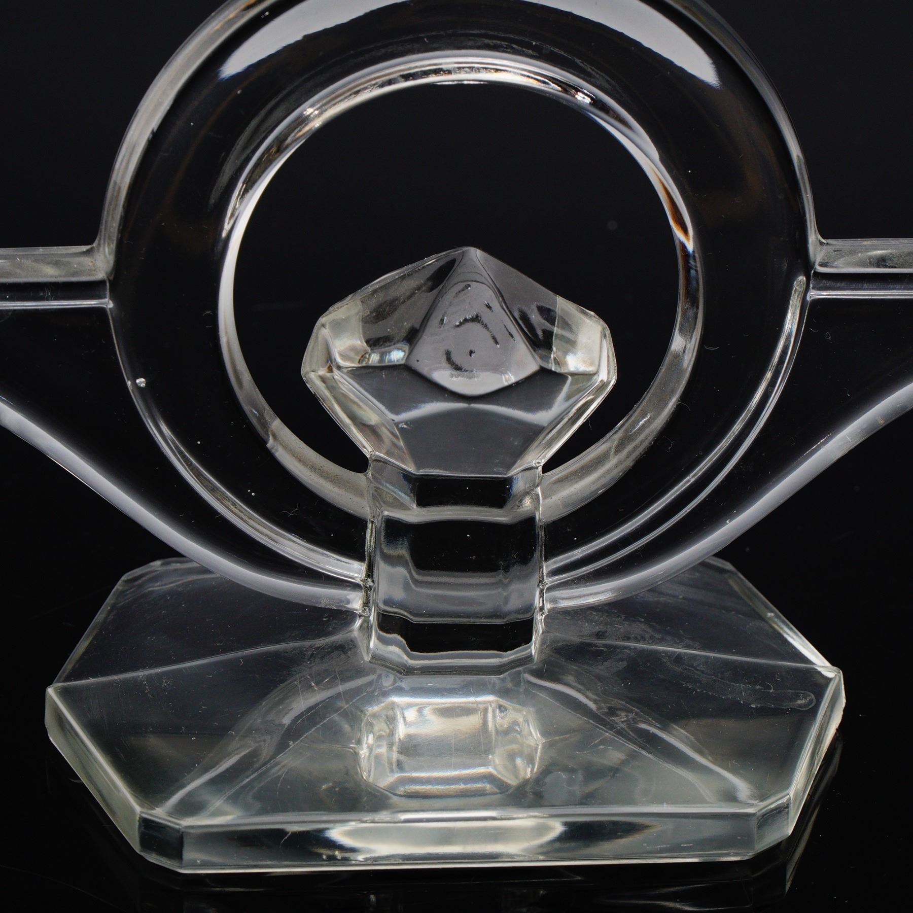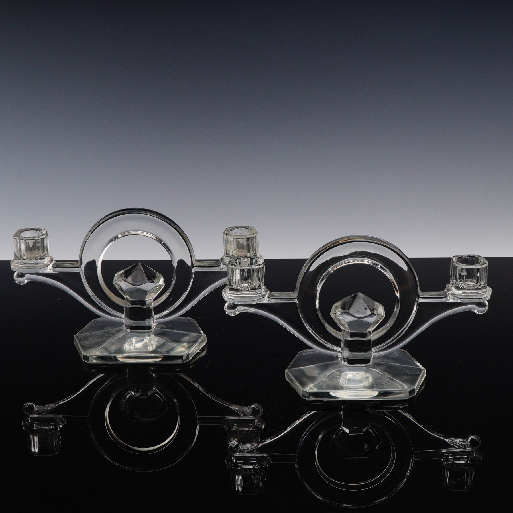 Elegant pair of Art Deco glass candlesticks featuring bold geometric design with circular centers, faceted diamond-like motifs, and octagonal bases. Each candlestick holds two tapers, with finely molded hexagonal bobeches adding visual depth. The clear glass construction highlights the clean lines and symmetry characteristic of the 1930s period. A striking decorative accent that blends functionality with refined early modernist design, perfect for collectors of vintage glassware and Art Deco home decor.