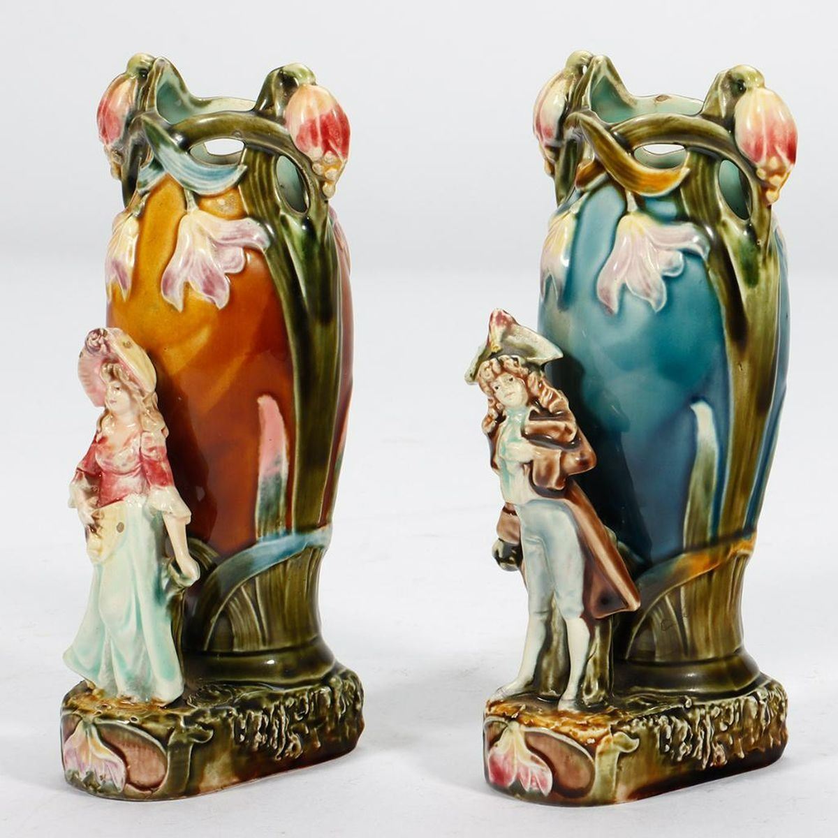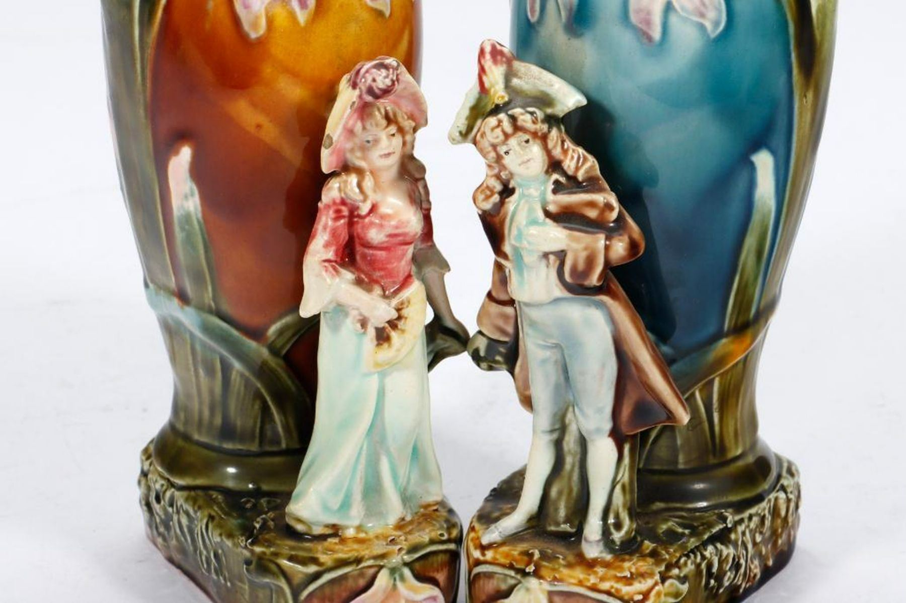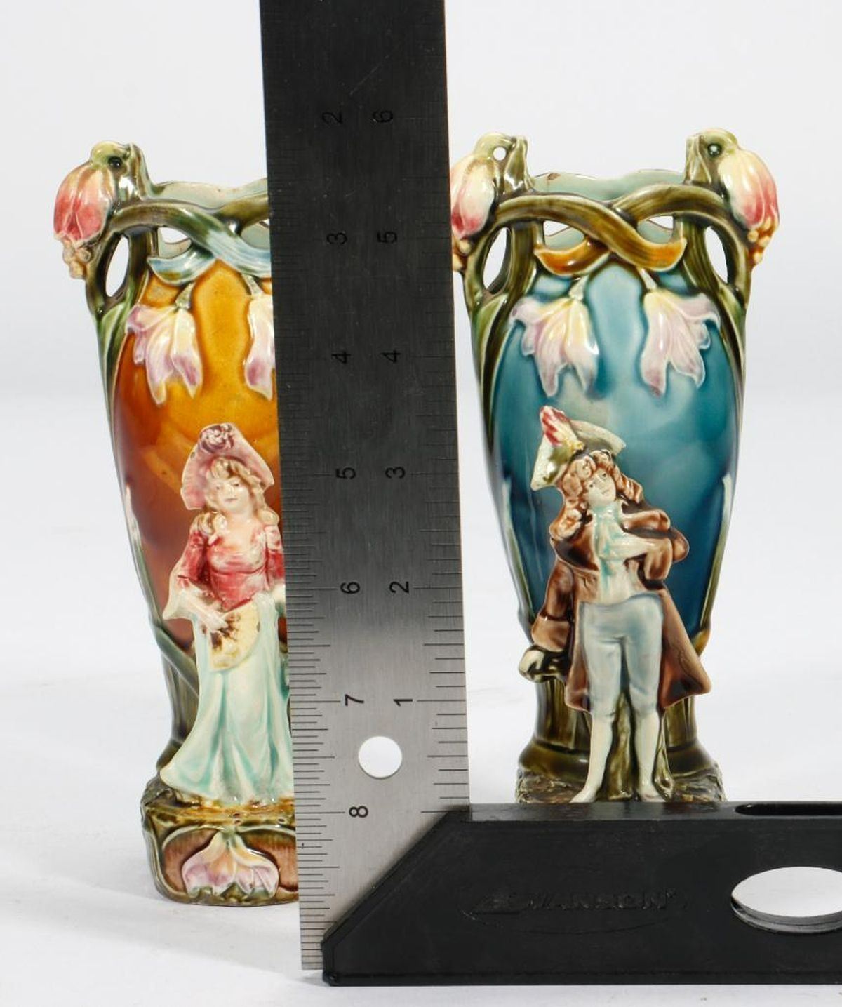 Floral and leaf molded ceramic vases with courtly lady and gentleman figures; unmarked/numbers only. Each 7in. h. Condition: No chips/cracks found.