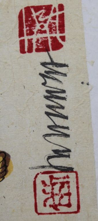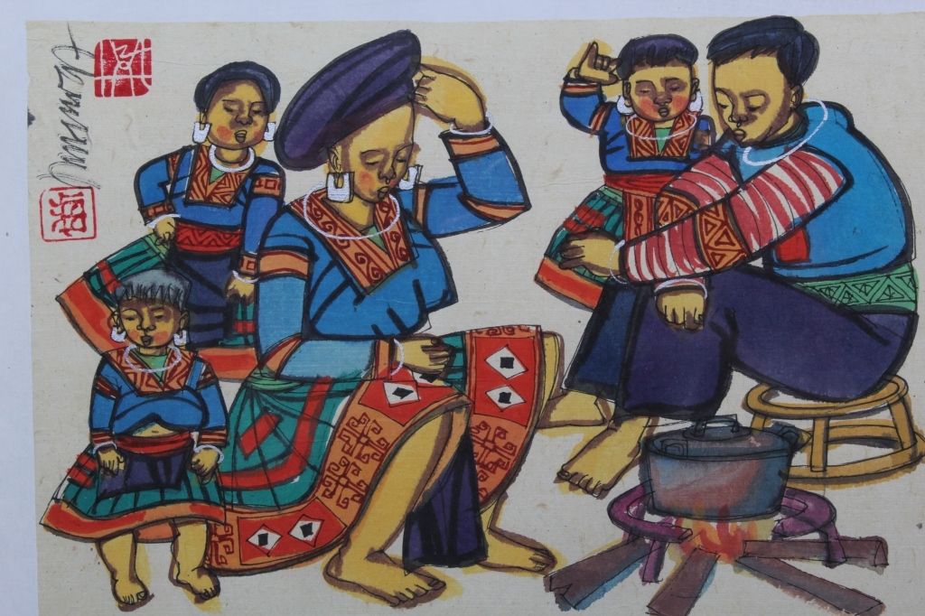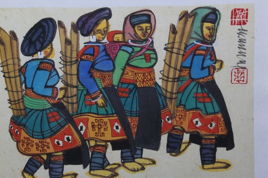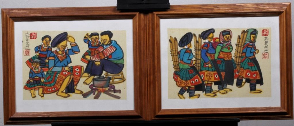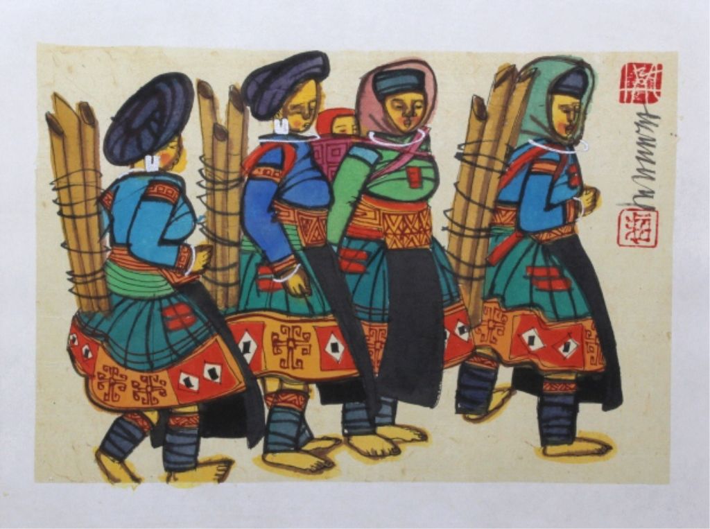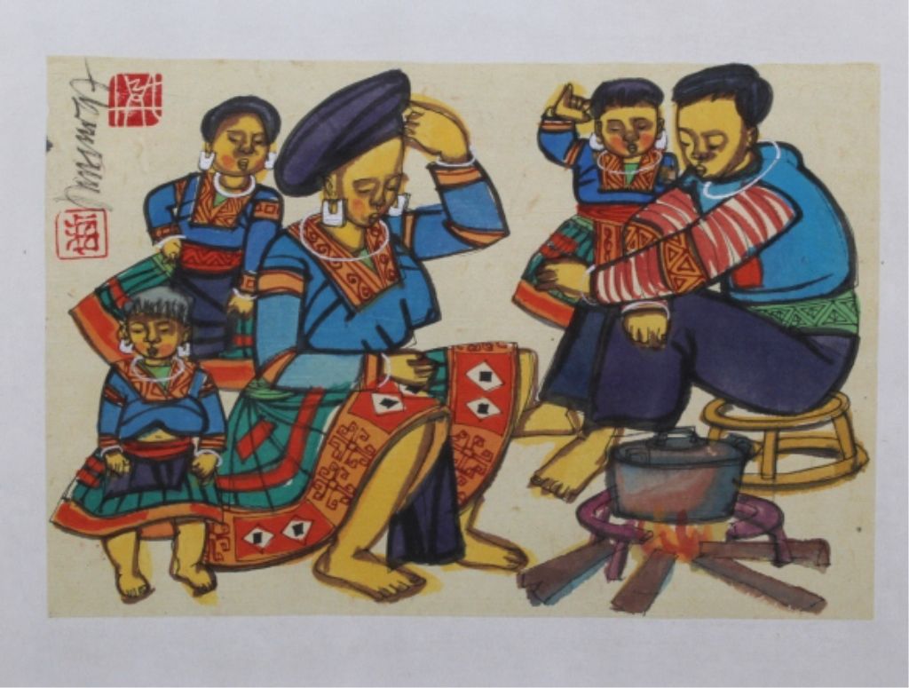 These are watercolor, ink, and oil pen original artworks on a very light woven paper mounted to board. Both are signed by the artist with dual chop marks. The works of art are from the 20th century. One painting features four Asian Females carrying bamboo and children in traditional clothing. The other features a family of five seated around a cooking pot also in traditional clothing awaiting for an evening meal. Both works are a set by the same artist and sell together. The frames measure 13.5"x16.5" and the artwork is 8"x11.5"