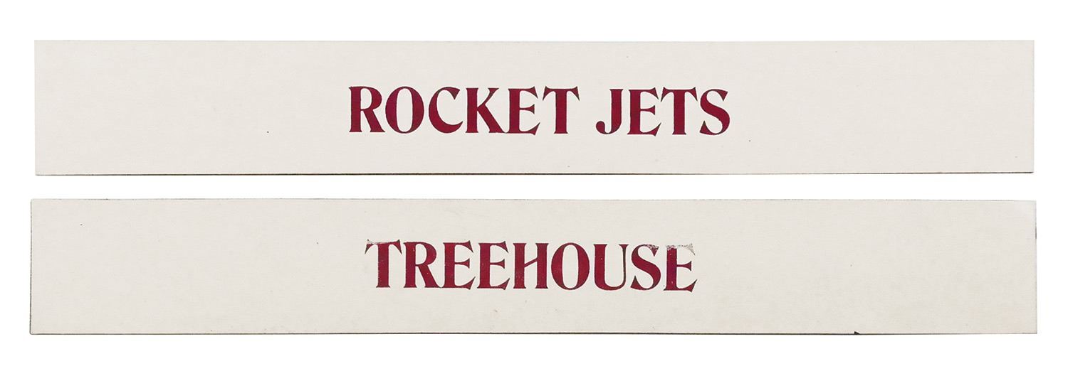 (Disneyland, c.1980s) A pair of original small signs used at the park's entrance to designate attractions that are temporarily closed. They are magnetic, so they could be swapped on or off depending on what was open or closed on that particular day. The signs are for the Rocket Jets and Swiss Family Treehouse attractions, with each measuring 1.75"x12". The condition is good with expected wear from use, including some minor color wear to some of the "Treehouse" letters.