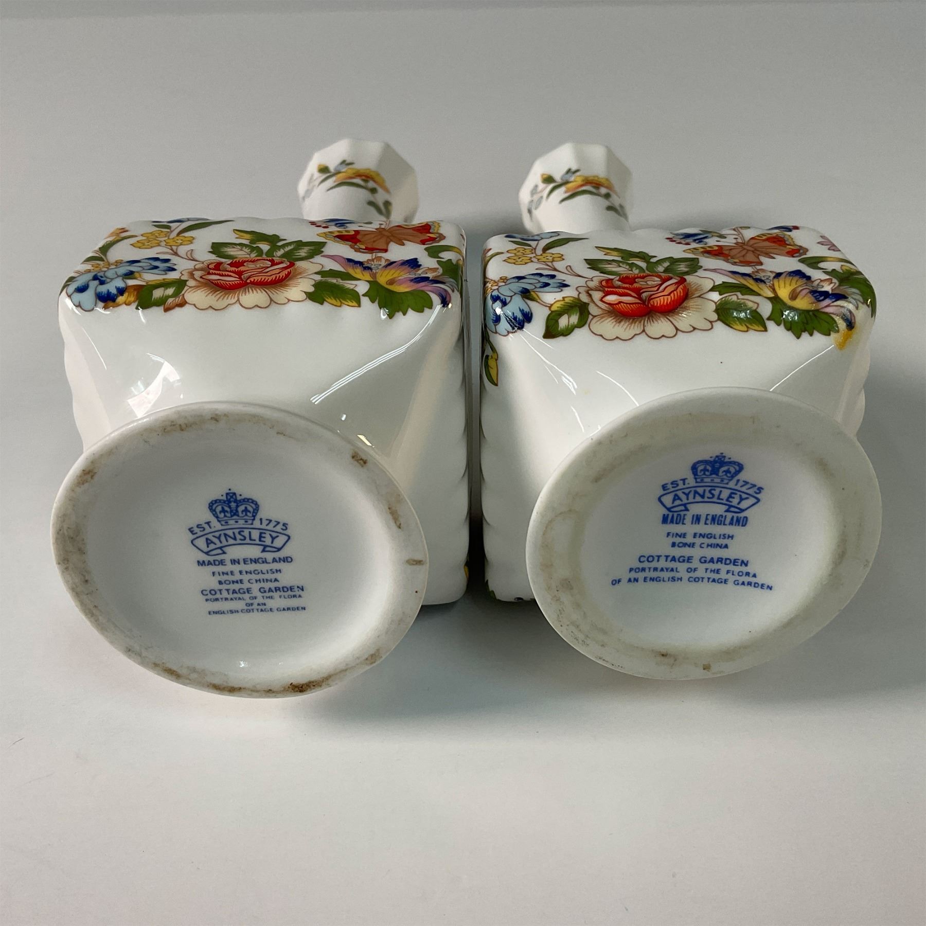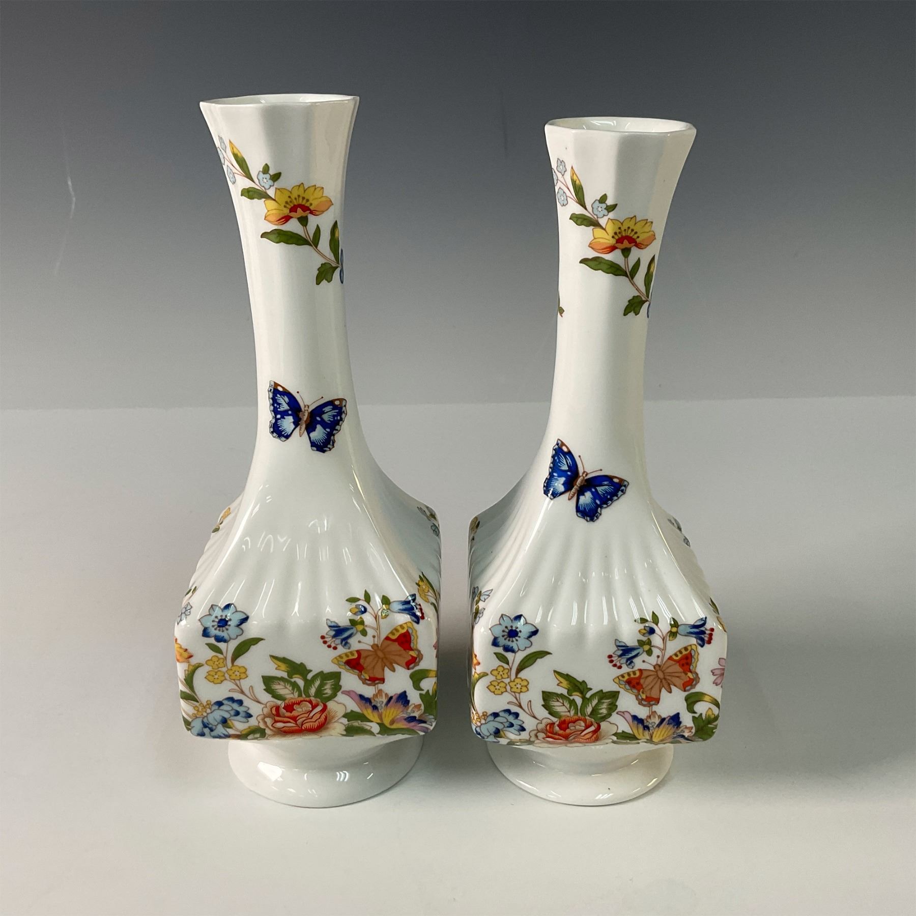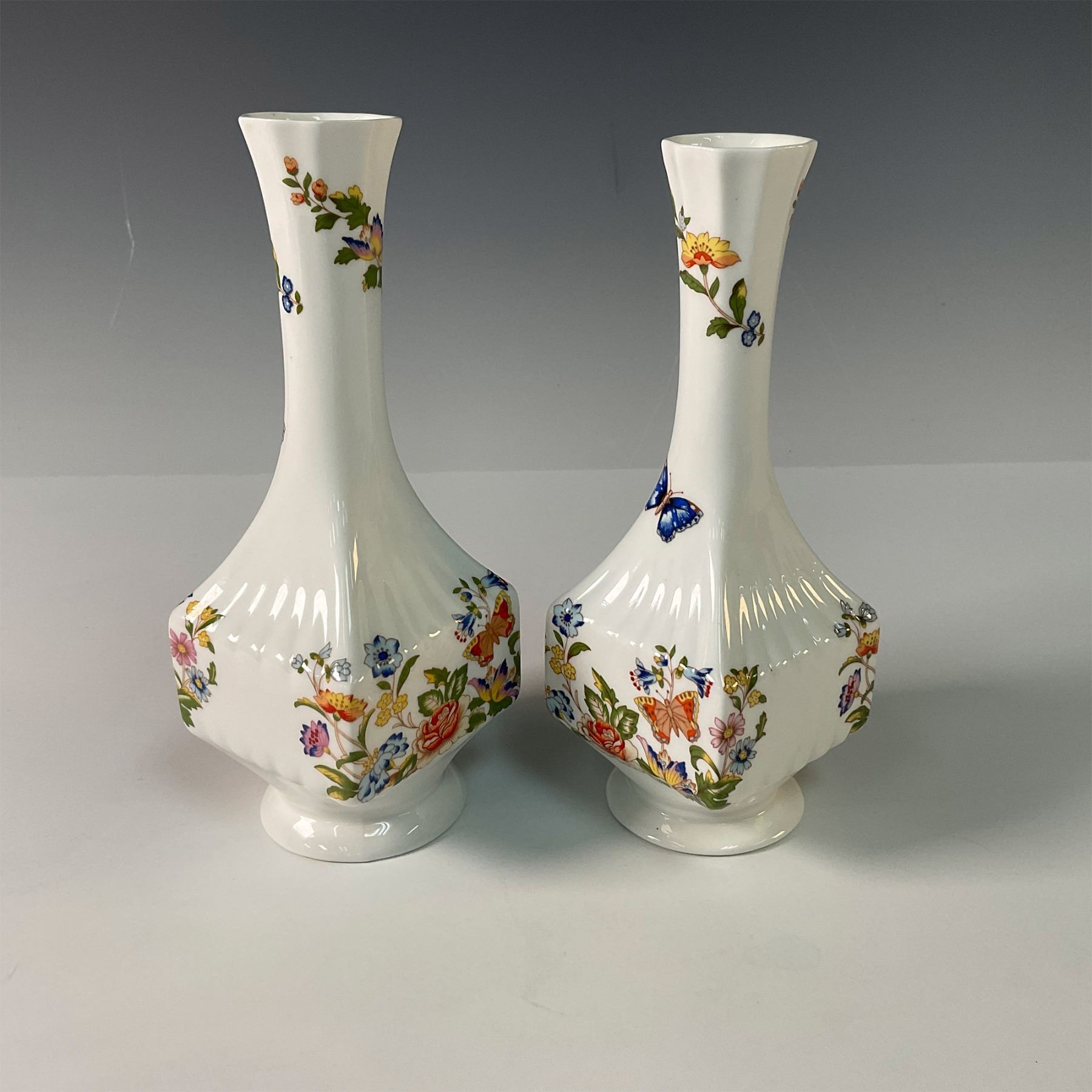 A beautiful pair of Aynsley bone china table vases in the Cottage Garden pattern. These finely crafted vases showcase vibrant floral designs inspired by the flowers of an English cottage garden, complemented by colorful butterflies. The intricate detailing and elegant shape highlight the renowned quality of Aynsley porcelain. Aynsley marked on the base, these vases are an excellent addition to any collection or as charming decorative accents.