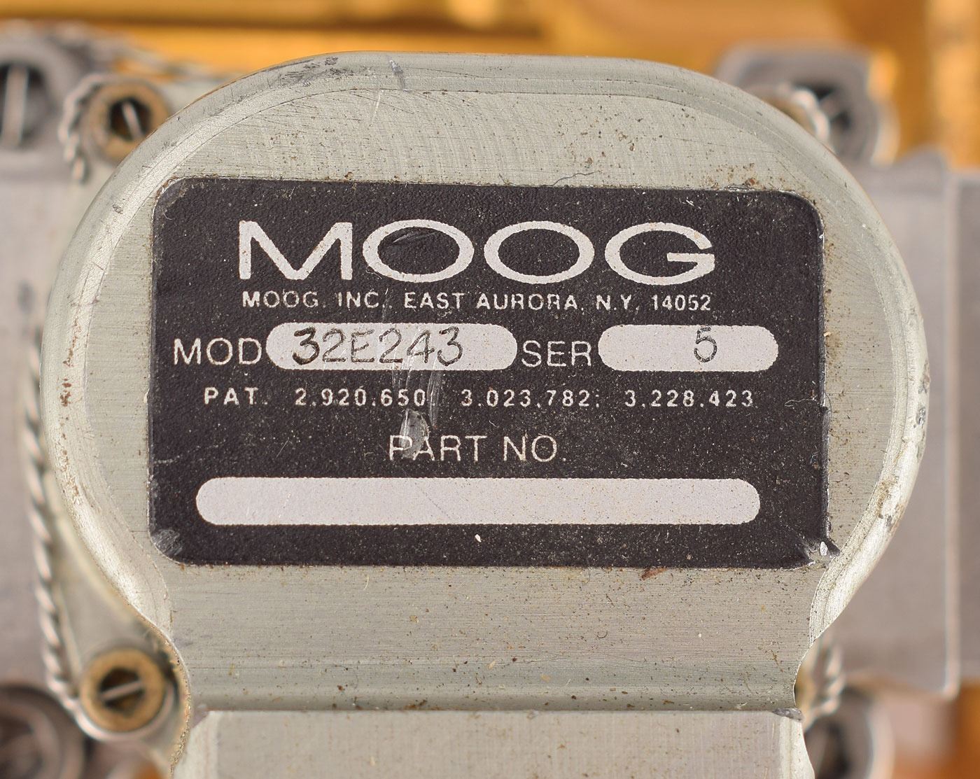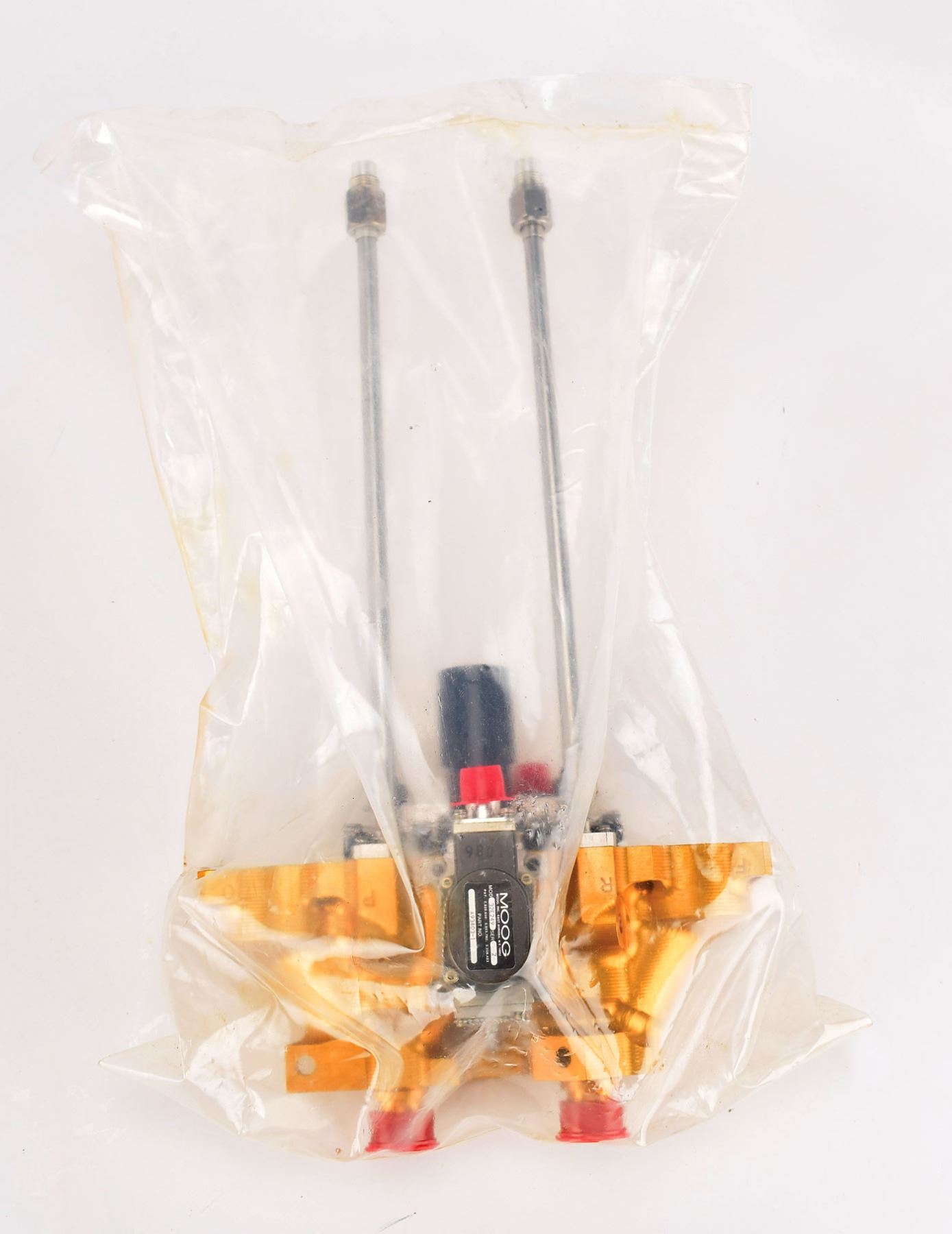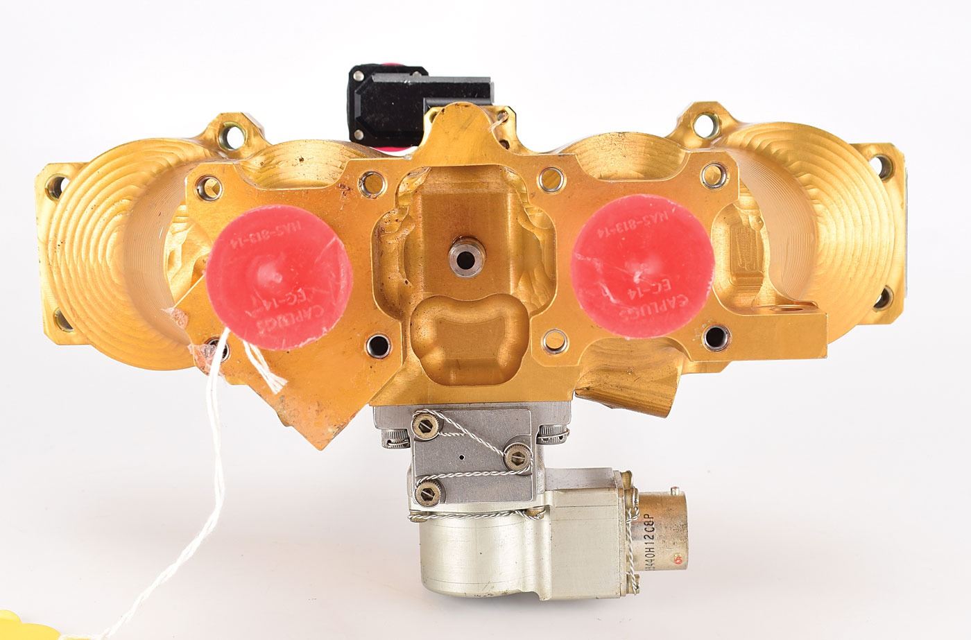 Attractive pairing of gold-plated BP Cavituri Valves made by Moog Inc., both 14.25 x 8.75 x 5.25, each bearing red valve caps and two manufacturer labels, which are marked accordingly: "Mod: 32E243, Ser. 5" and "Part No. A13400–3, Mod. W54–017 A, Ser. 002," and "Mod. 32E249, Ser. 2, Part No. A93403–1" and "Part No. A13400–1, Mod. W54–017, Ser. 001," with the latter valve sealed in its original bag. In overall very good to fine condition.