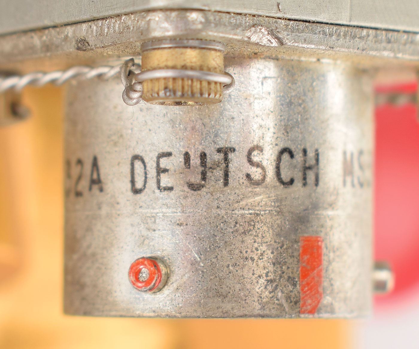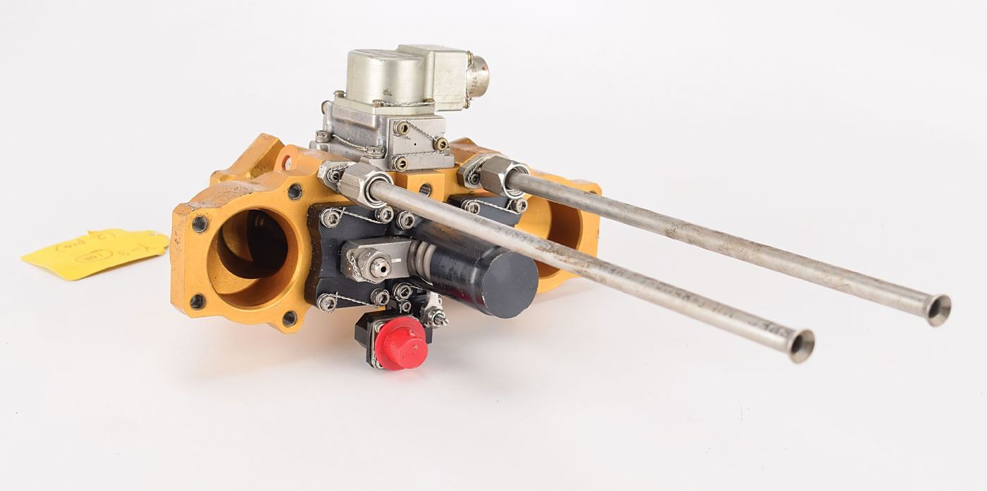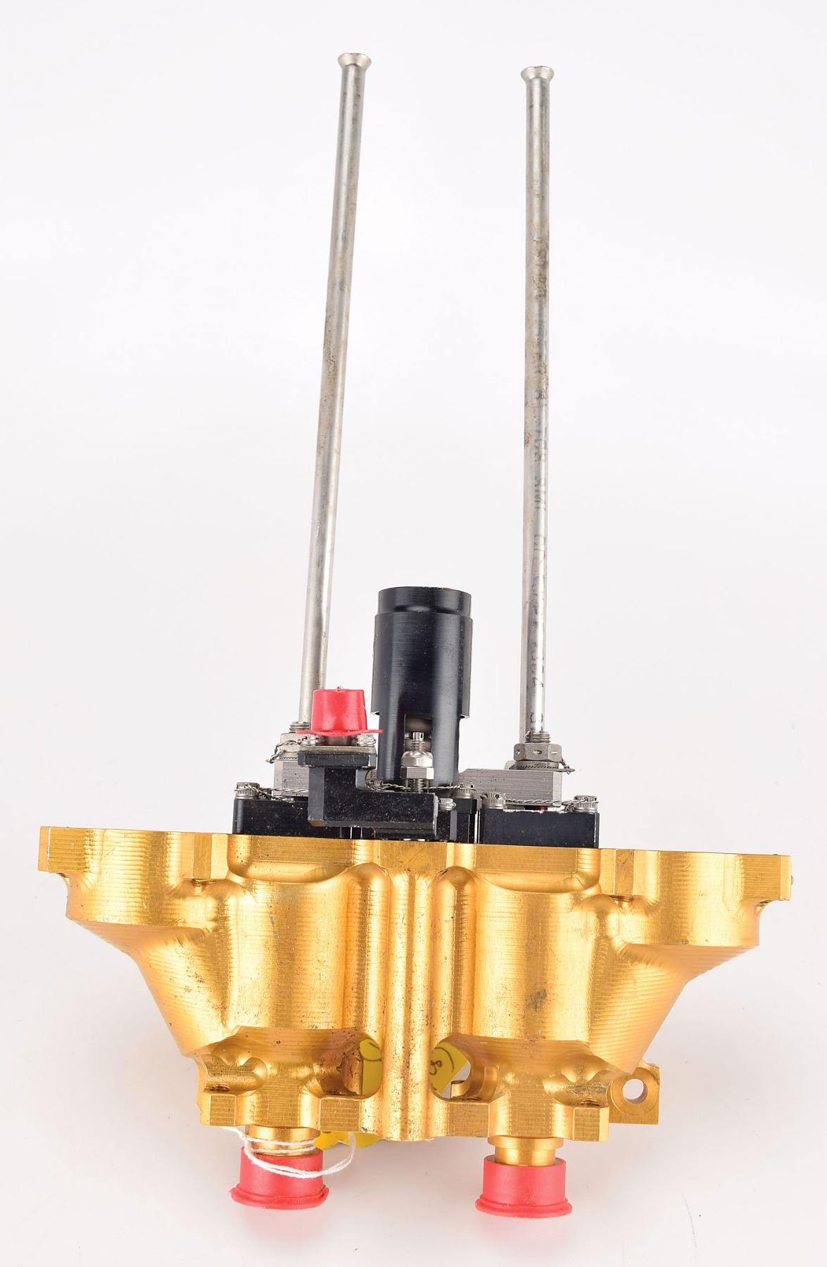 Attractive pairing of gold-plated BP Cavituri Valves made by Moog Inc., both 14.25 x 8.75 x 5.25, each bearing red valve caps and two manufacturer labels, which are marked accordingly: "Mod: 32E243, Ser. 5" and "Part No. A13400–3, Mod. W54–017 A, Ser. 002," and "Mod. 32E249, Ser. 2, Part No. A93403–1" and "Part No. A13400–1, Mod. W54–017, Ser. 001," with the latter valve sealed in its original bag. In overall very good to fine condition.