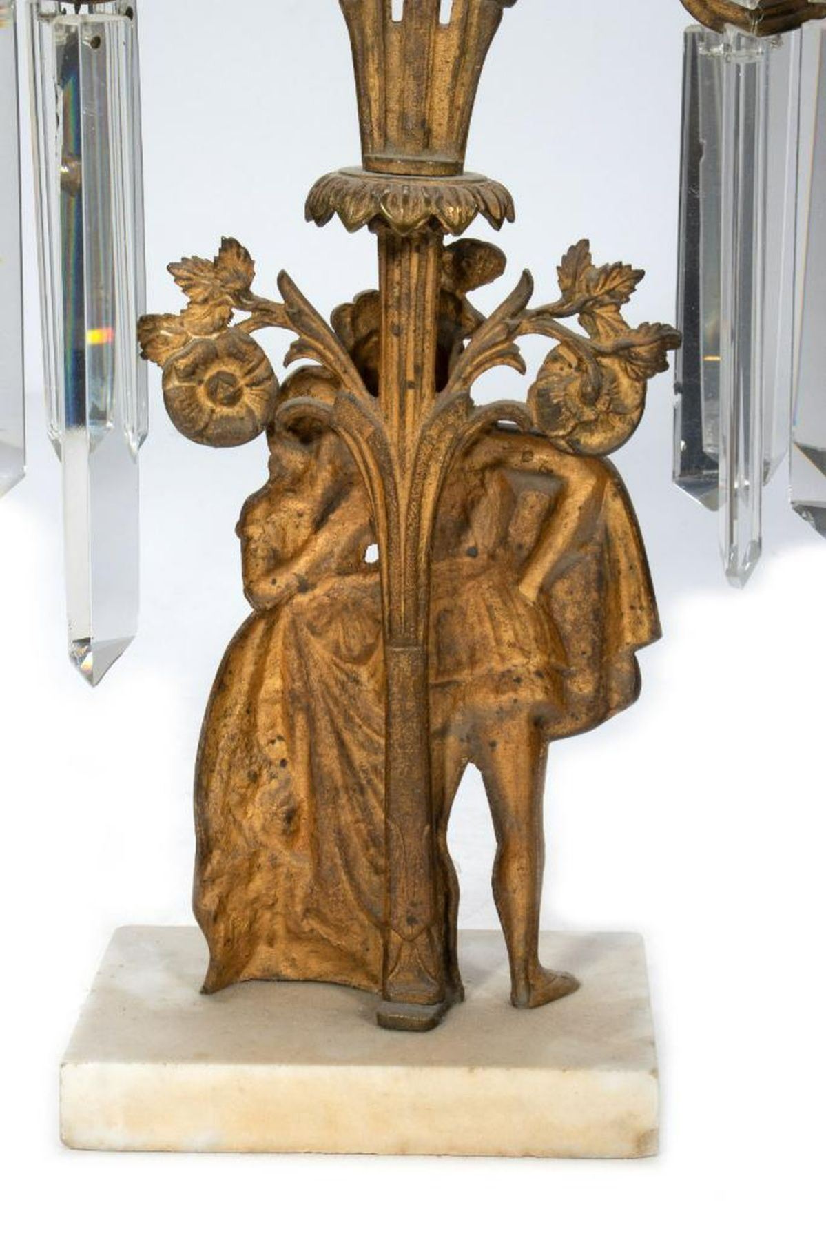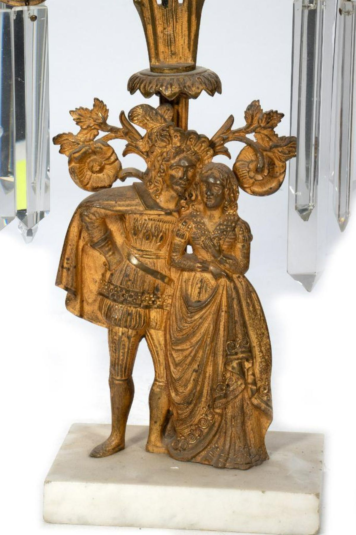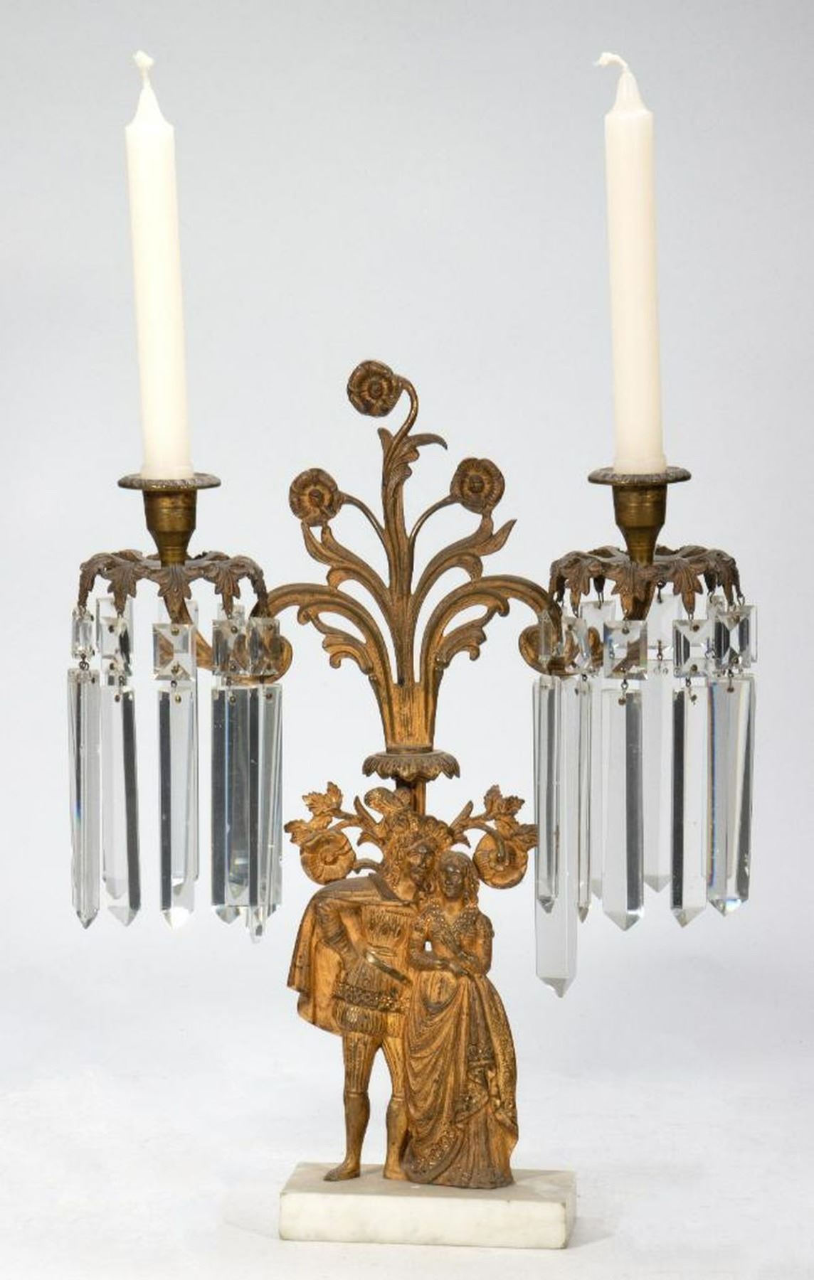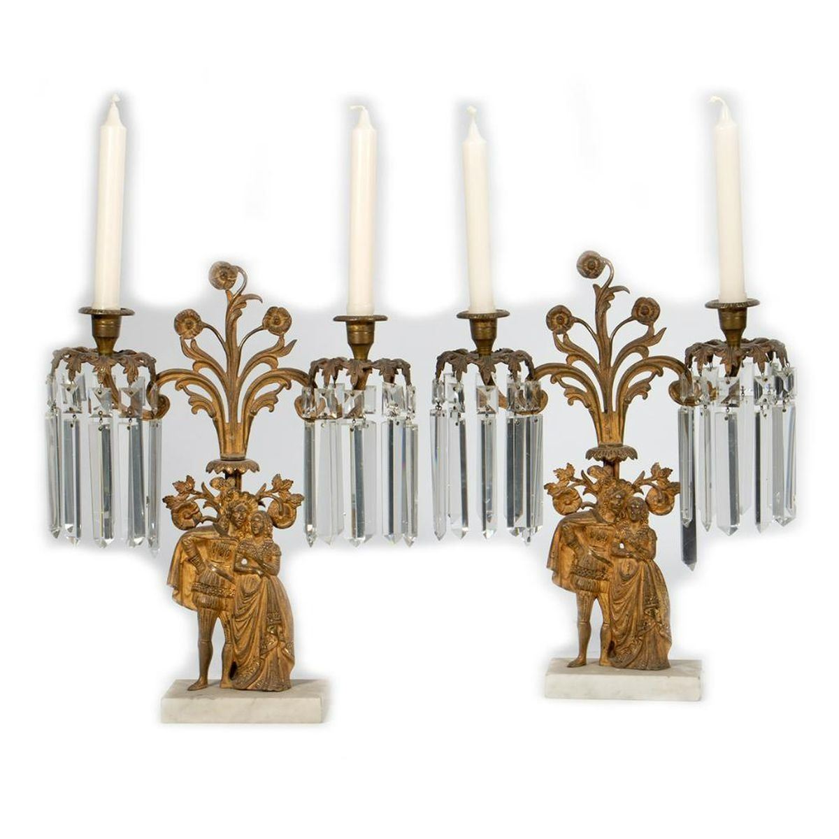 Each two-light candelabra cast with figures in Renaissance costume and hung with faceted drops. 16in. h.