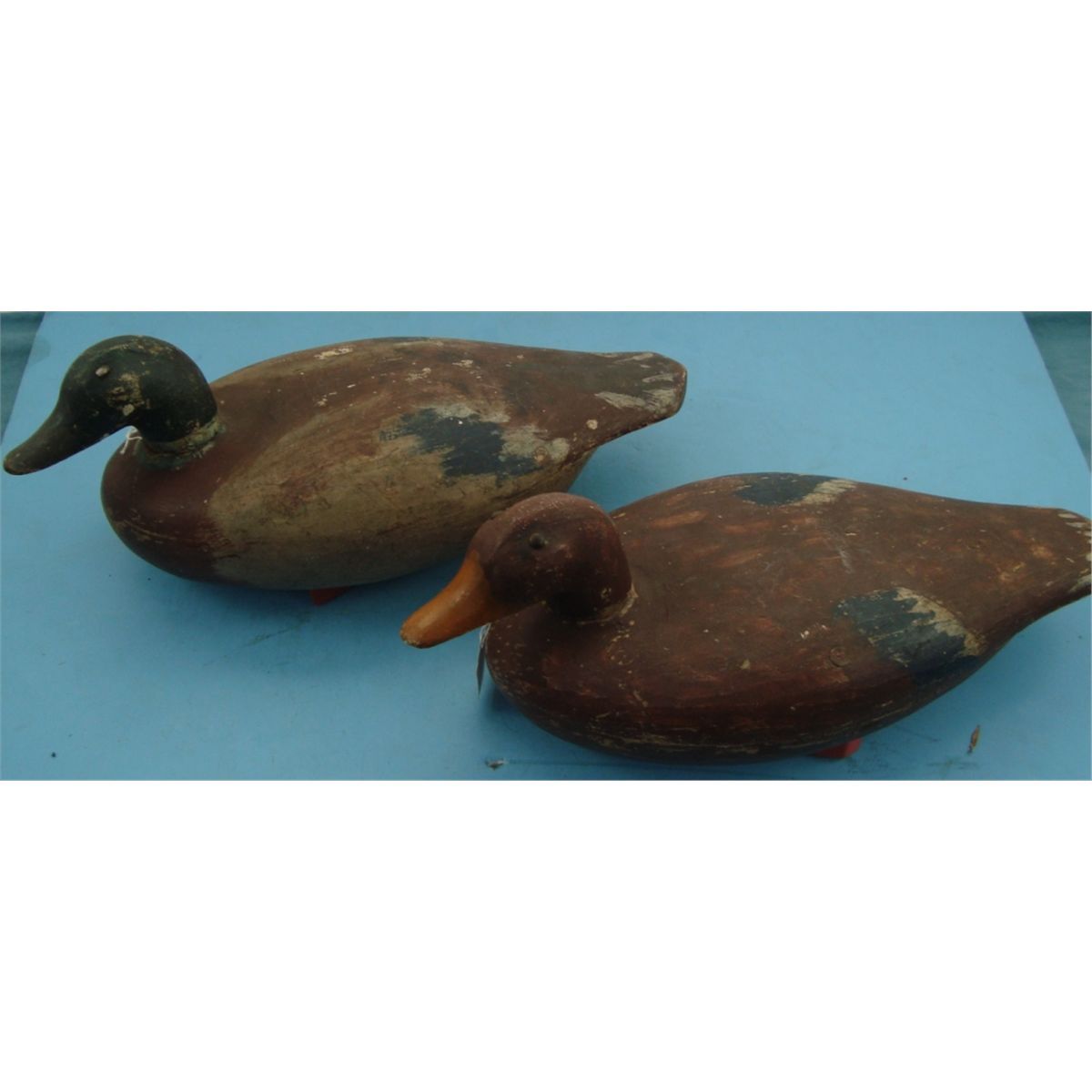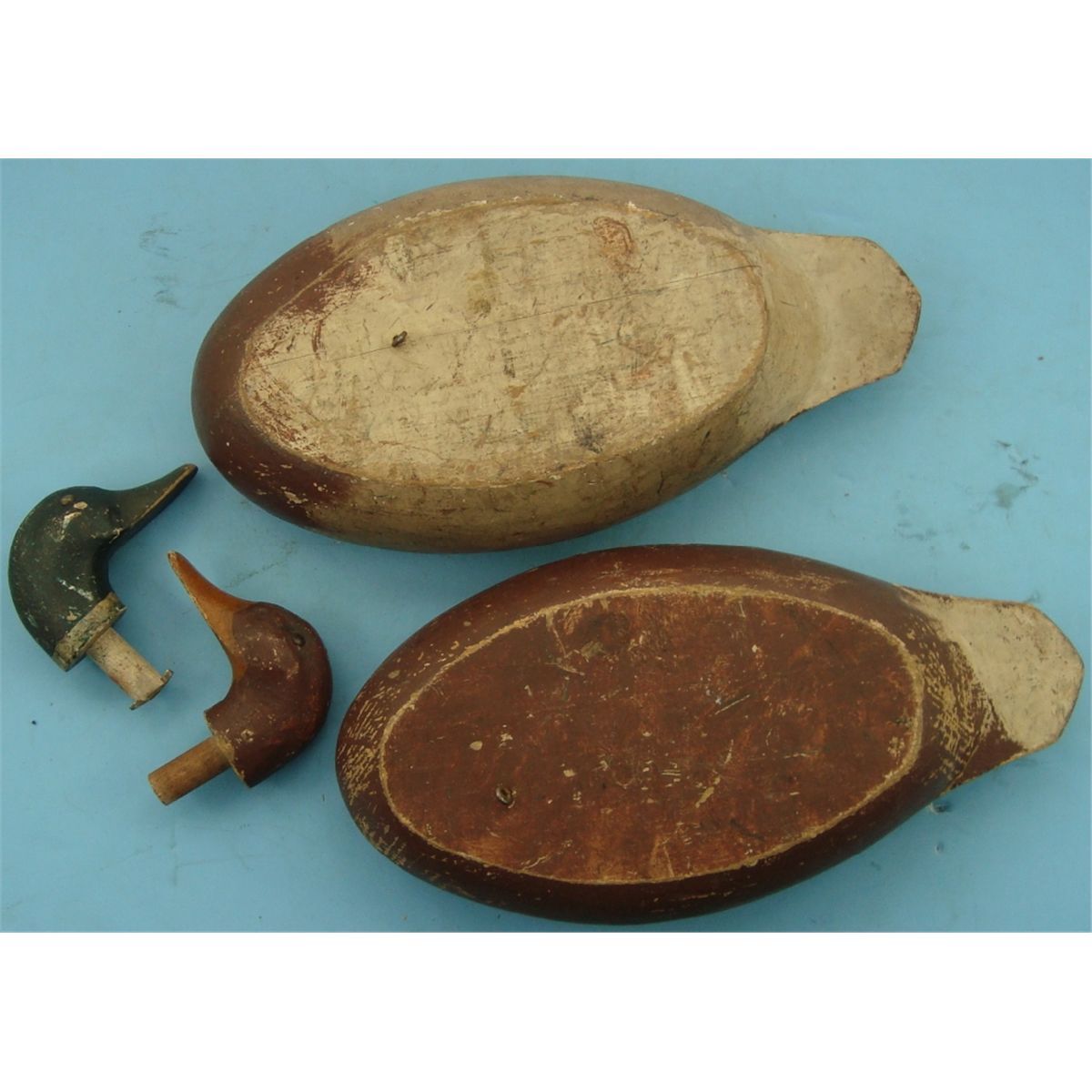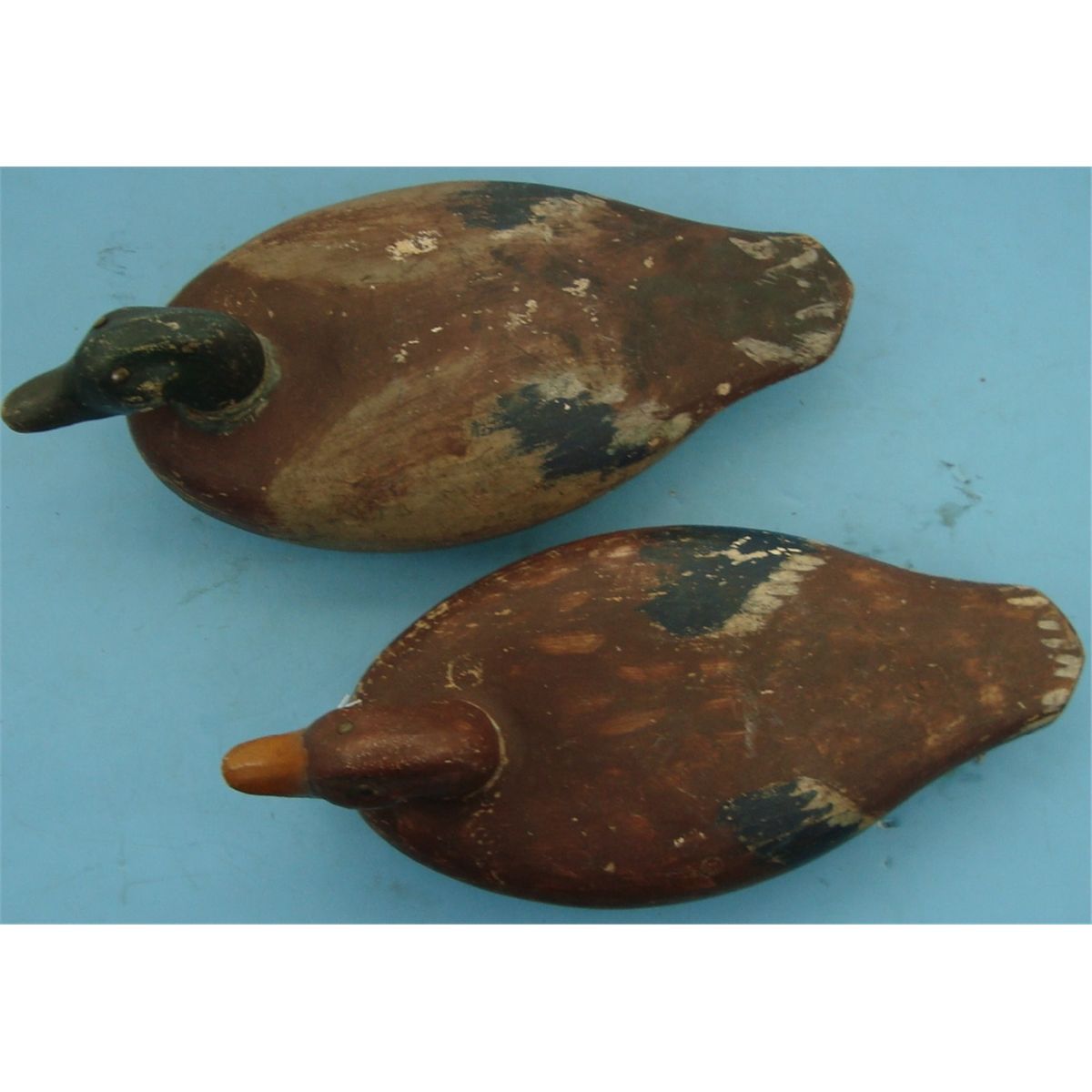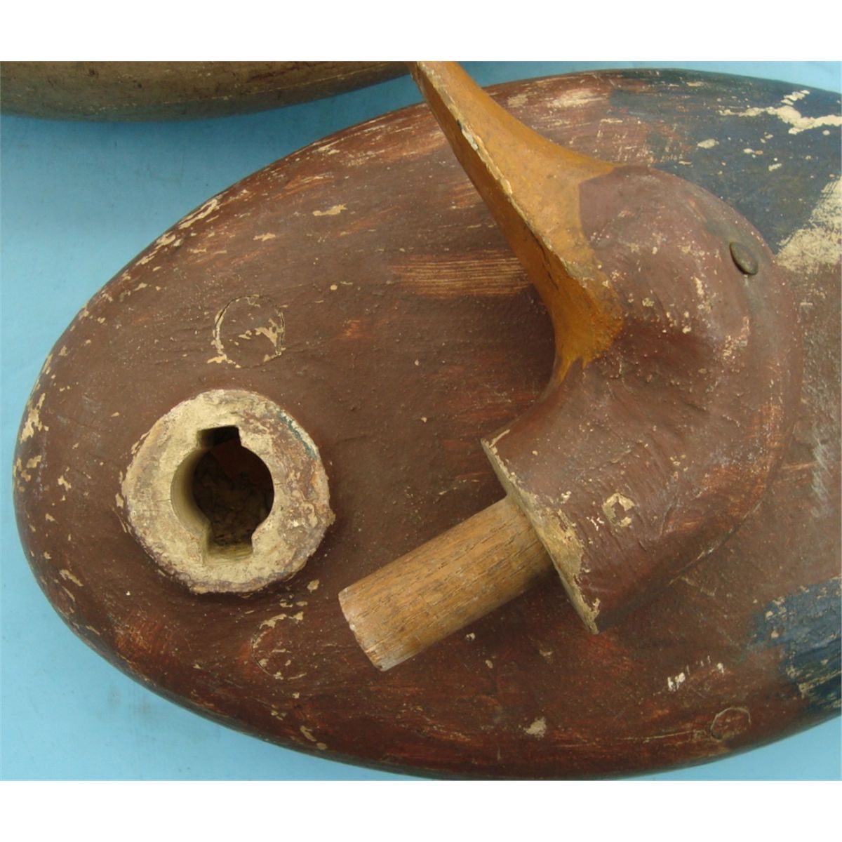 Solid wood bodies measuring approx. 15" in length w/heads that are removable for transporting. Decoys are in overall nice condition attributed to Bay City WI.