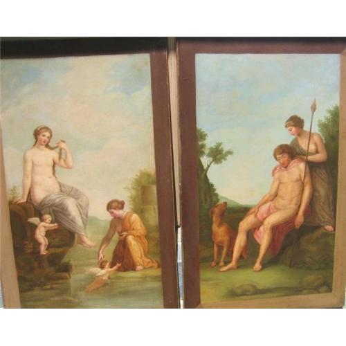 Is a Pair of Mythological paintings frame in an antique frame ,made in England in 18 or early 19 century. Have be restored. Oil/canvas Size: 25" x 41 1/2 " no frame included for the size All sales are final,no exchange, no credit, no return,if you have any questions please do it before the final sale.