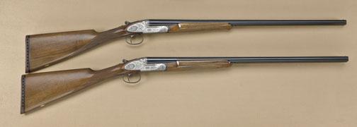 Pair of Bernadelli 20ga side by side shotguns, Roma #4 Ejector model, 20ga, boxlocks with sideplates, 27” barrels, English style straight stocks, automatic ejectors, single trigger, nicely engravedwith bright finish on action and sideplates, serial #115300. Gun #1 is choked “Cylinder” (right) and “Improved Cylinder” to “Cylinder” (left). The gun shows little handling and almost no use, just some possibletest-firing. Stock measures 14-1/4” to the end of the wood, 14-7/8” to the end of the factory thin-line recoil pad. Gun #2 shows matching configurations and barrel length and is choked “Cylinder” (right) and “ImprovedCylinder” to “Cylinder” (left). The owner’s trophy plate inlaid into the body of the stock and is engraved “H.P.” and is also engraved at the top of the leather-covered luggage case. Gun #2 is in excellentcondition showing 97-99%. Includes original paperwork in box. From the Robert Petersen collection. Est: $2,500 - $5,000