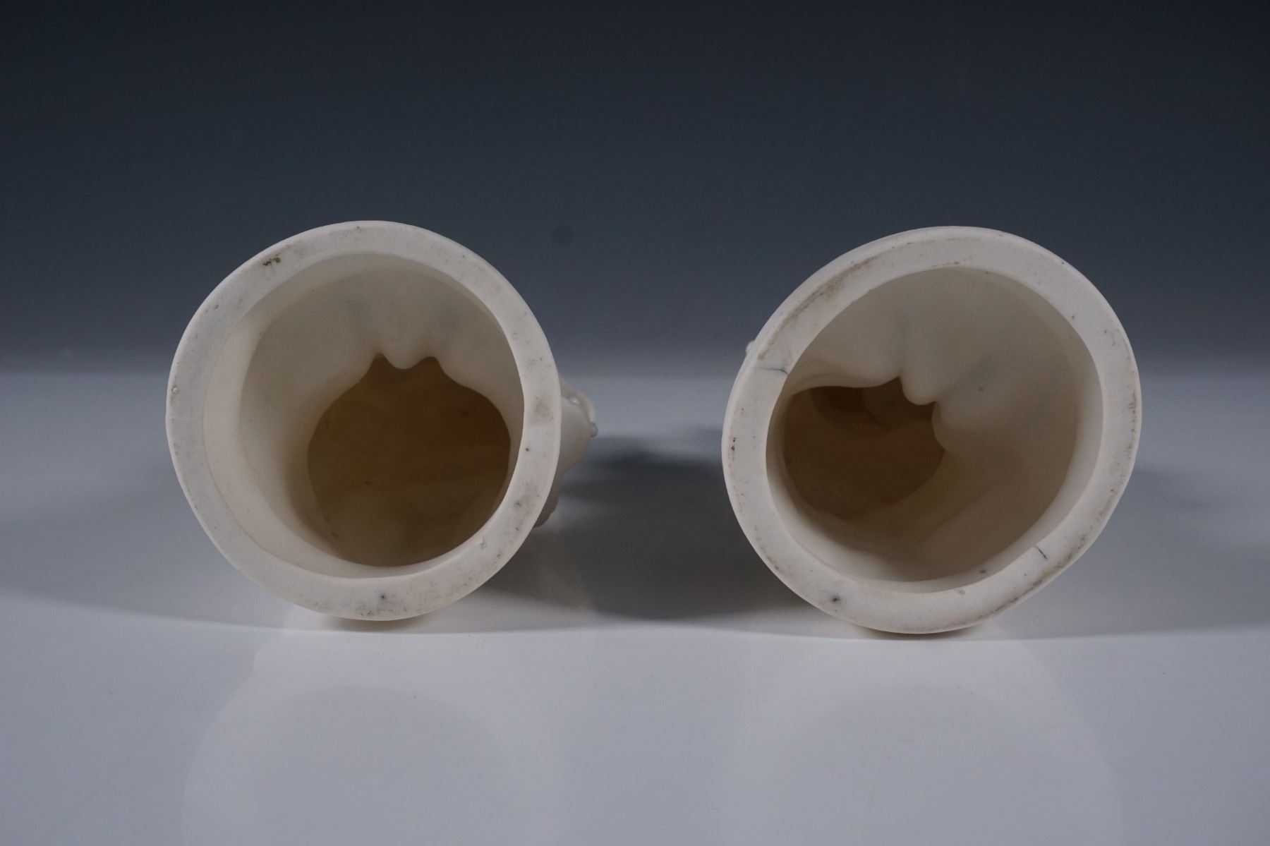 A pair of bisque porcelain figurines depicting a boy and girl, each carrying a small dog. The figures feature intricate detailing with raised gold bead accents, black-painted shoes, and delicate facial expressions. The girl wears a hooded cape, while the boy dons a hat and knee-length coat, both standing on rounded bases with textured ground elements. Crafted in unglazed bisque porcelain, these figures exhibit fine craftsmanship.