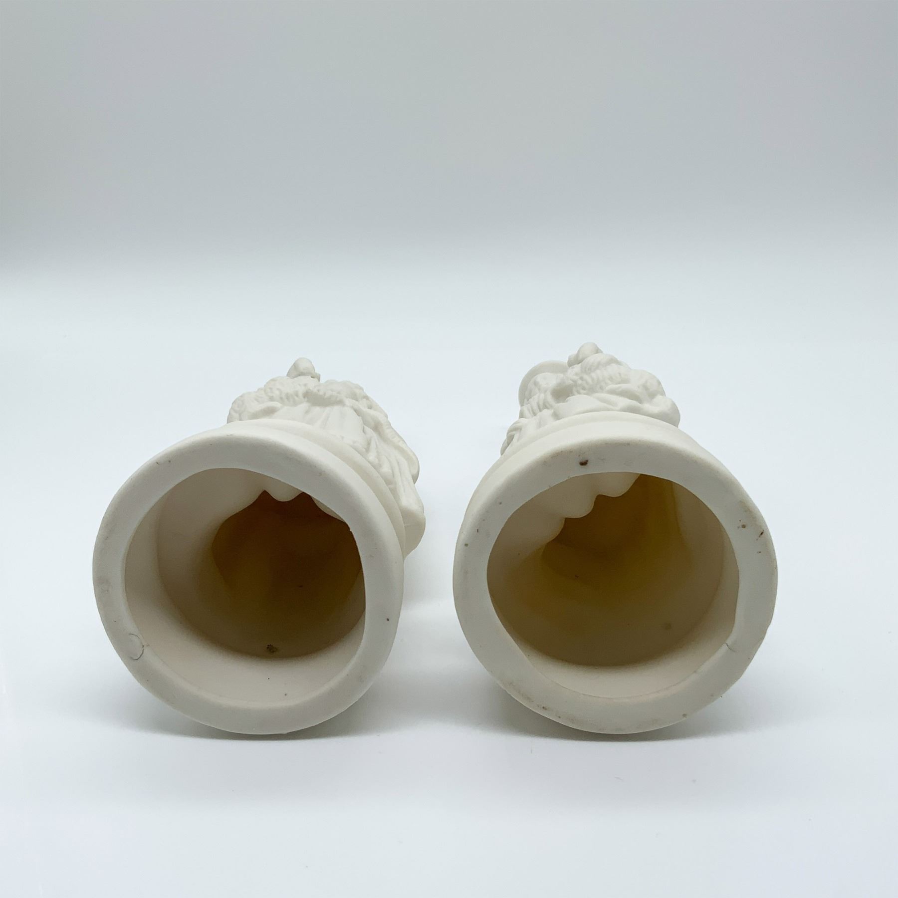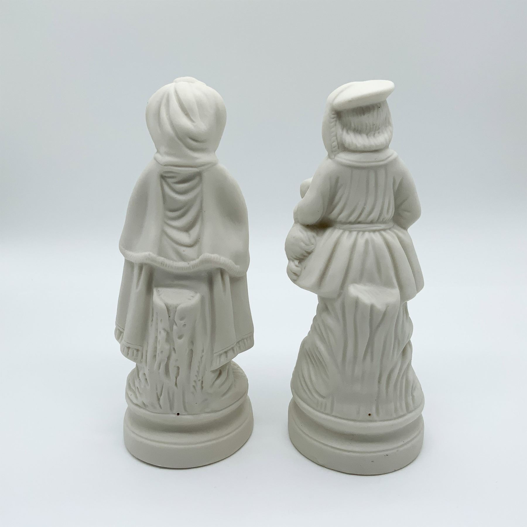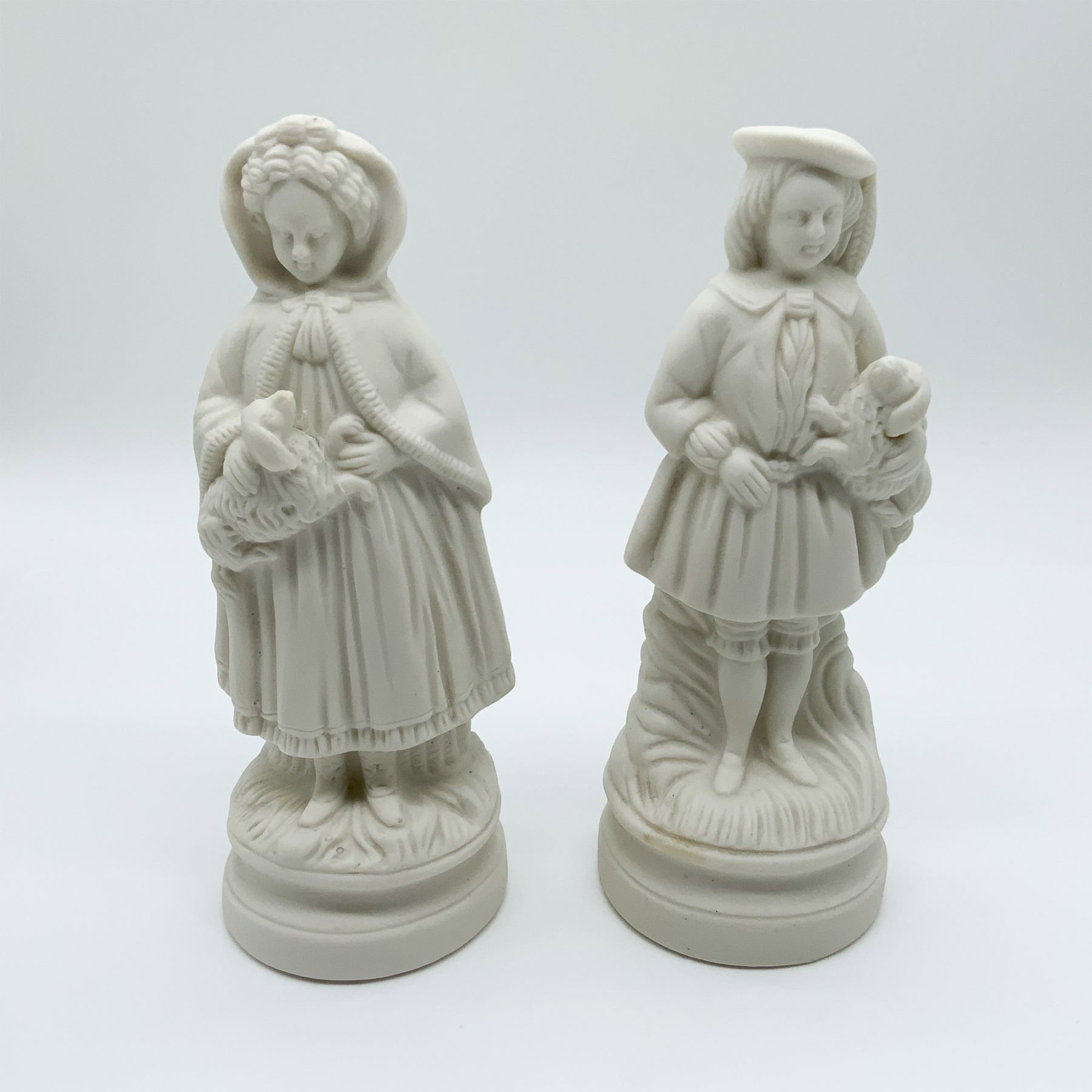 Pair of bisque porcelain figurines featuring a girl with a lamb and a boy with a bird. Detailed Victorian-style design with a matte finish. Unmarked bases, measuring 7.25”H. Perfect for porcelain or vintage decor collections.