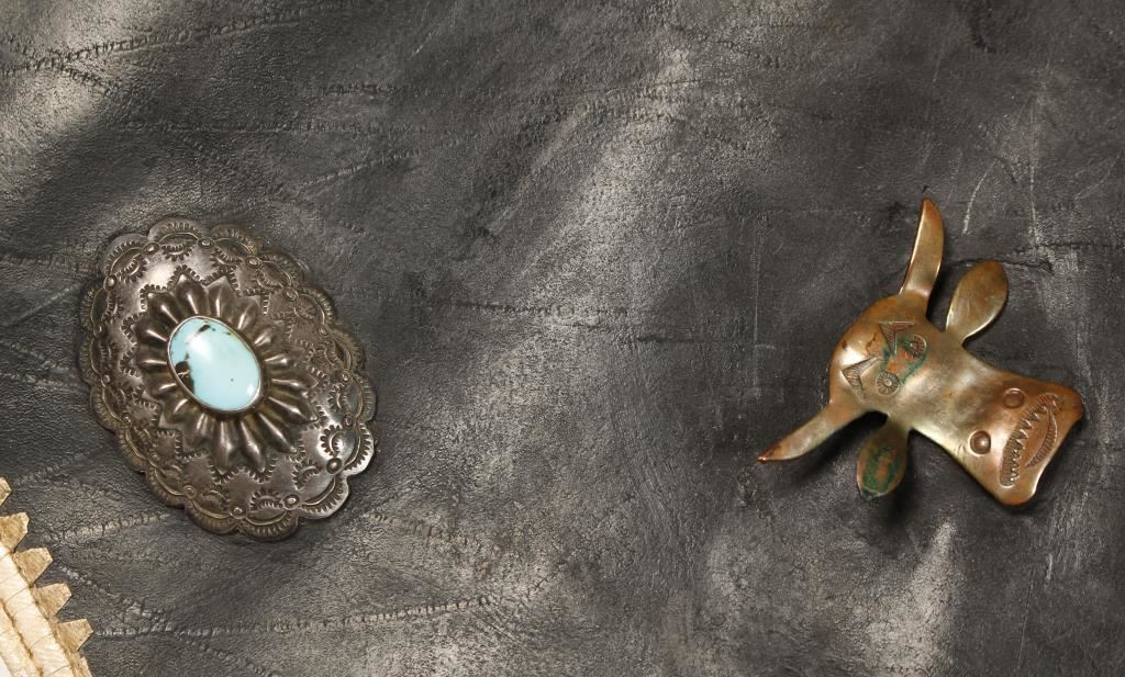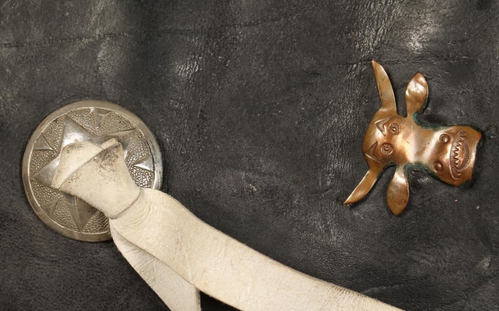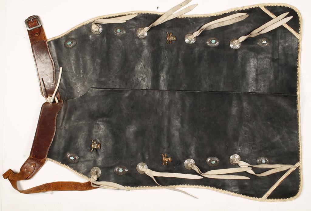 Silver mounted Conchos with Turquoise Accents. Trimmed in white with white tassels, unmarked,.