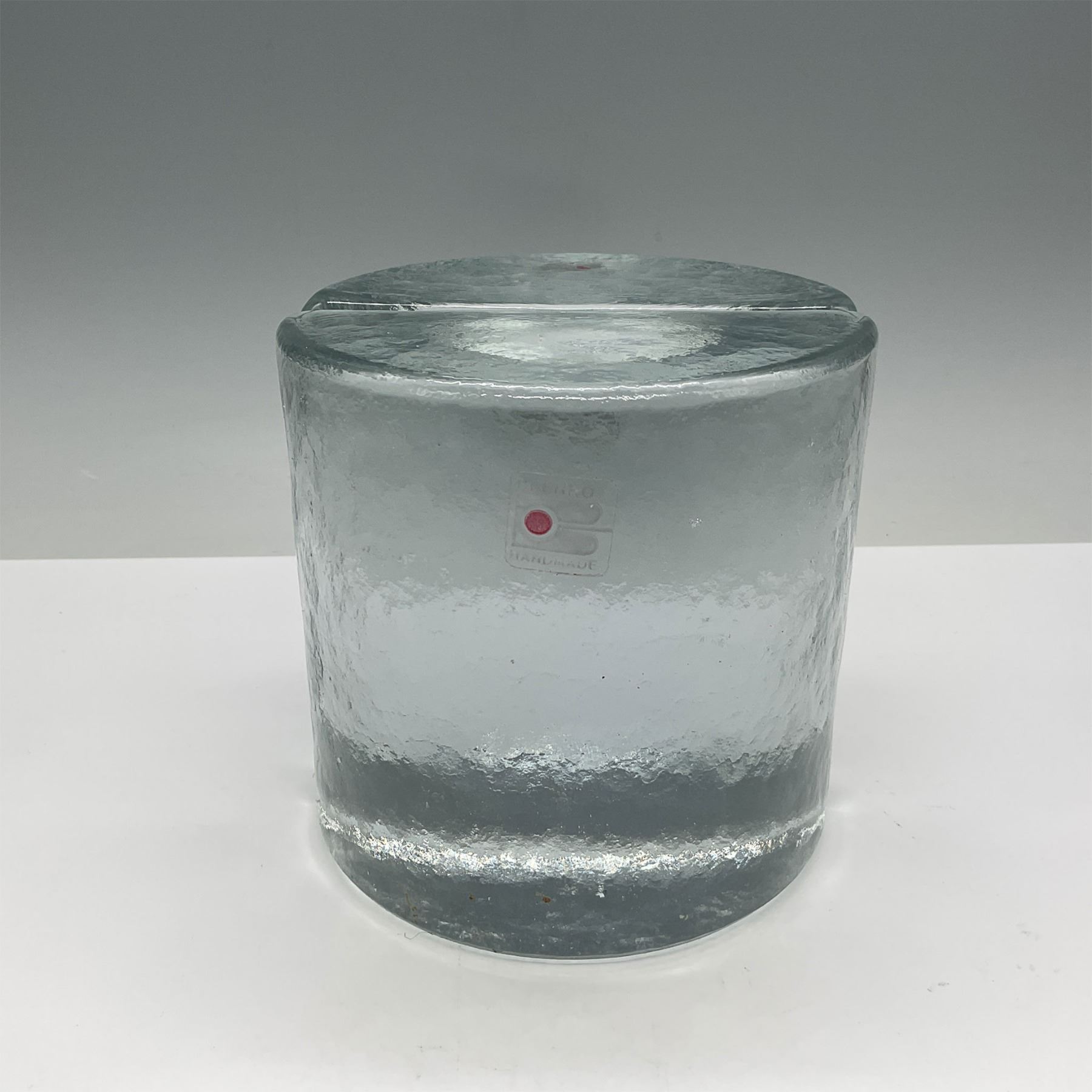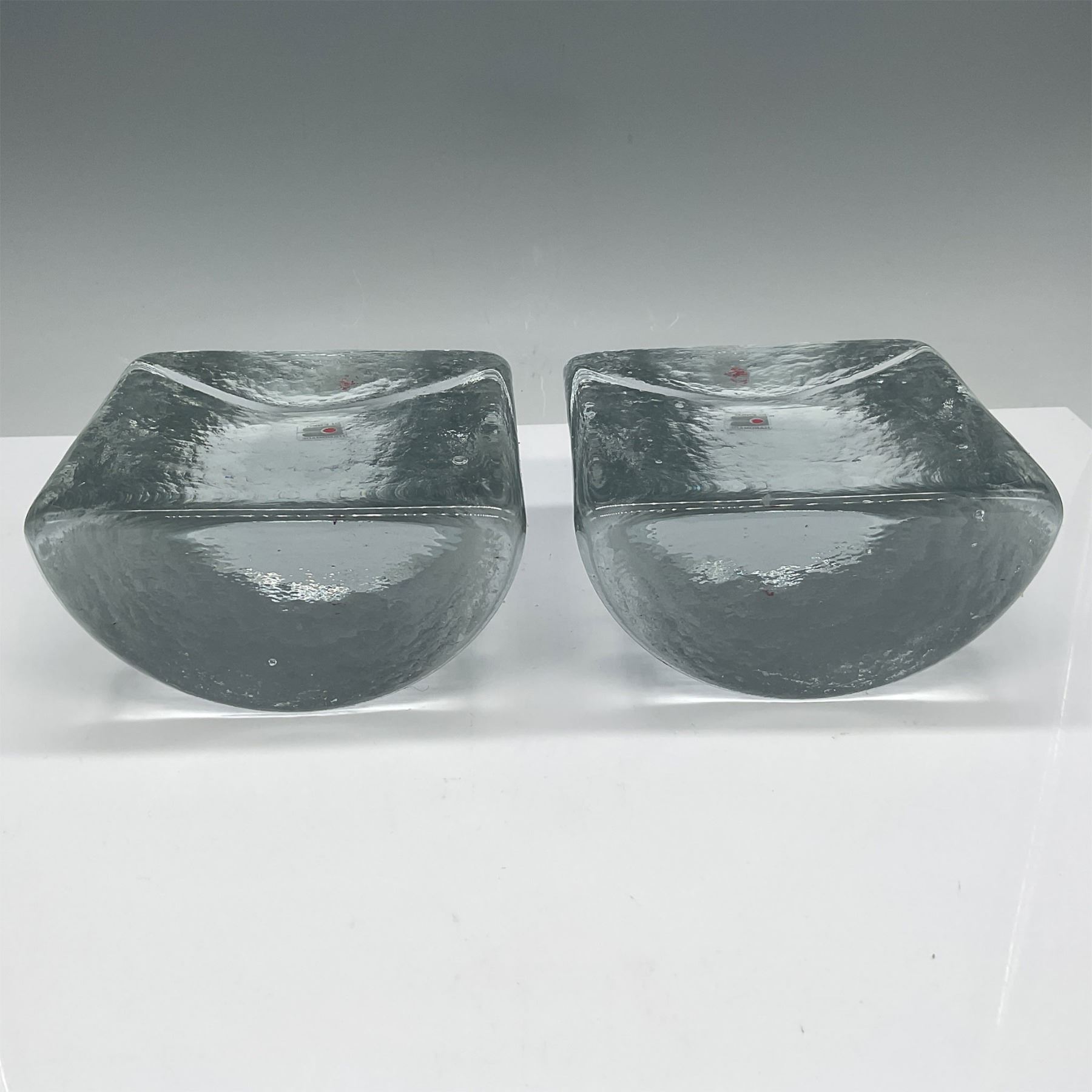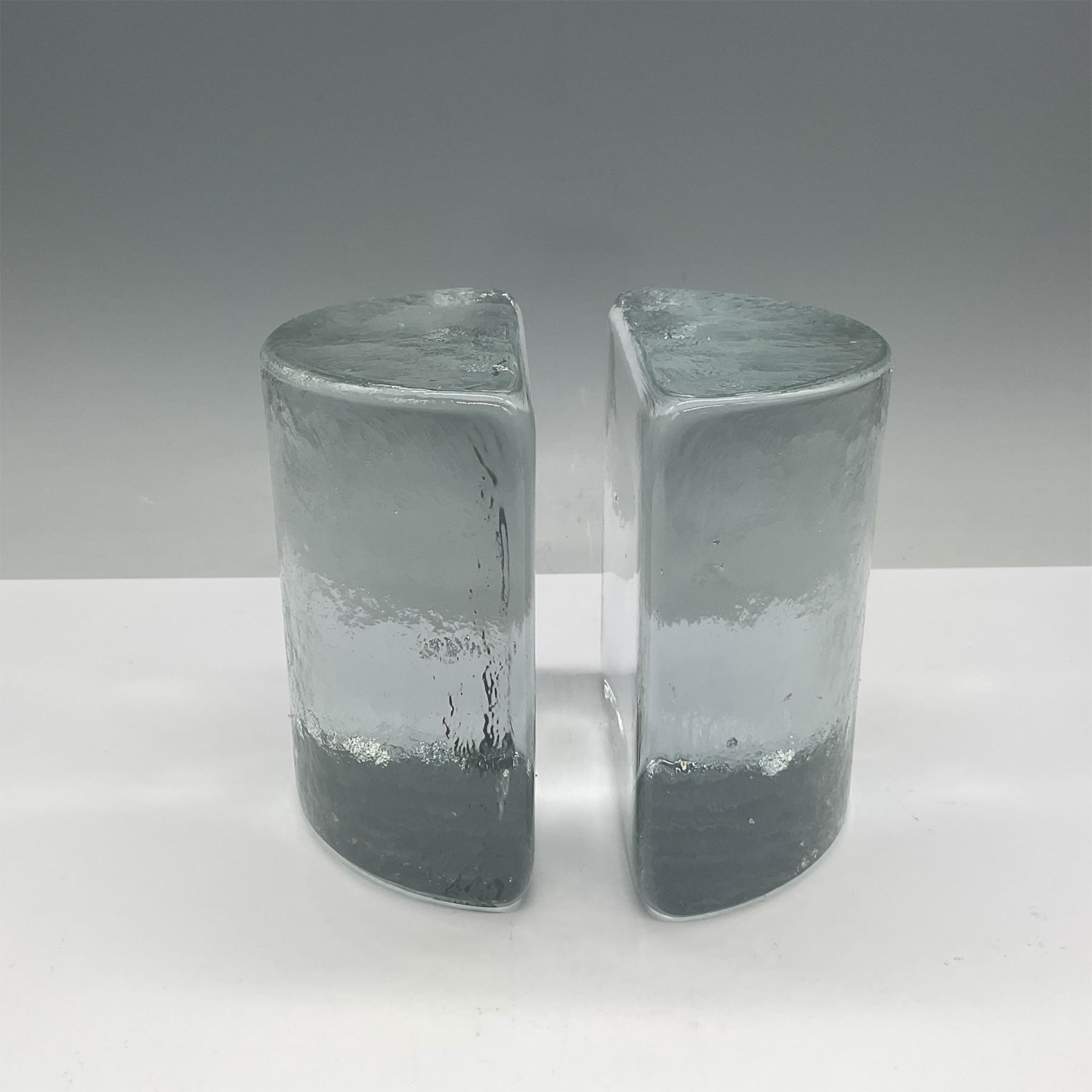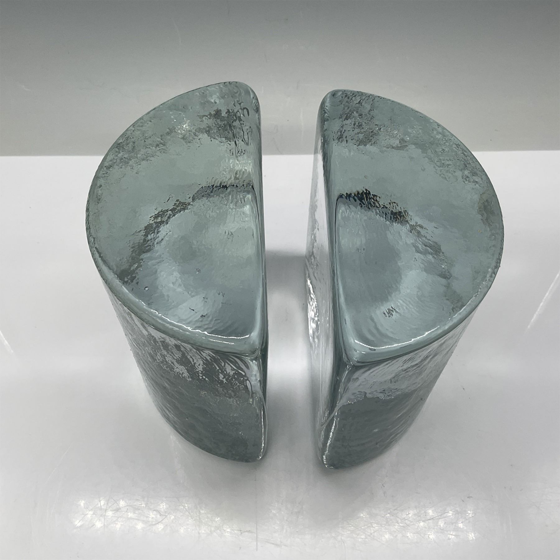 Pair of Blenko glass bookends with a distinctive ice-textured finish, showcasing the brand's signature craftsmanship. These bookends feature a semi-cylindrical design, split into two halves that form a complete cylinder when paired. Retaining the original Blenko label, they highlight the handmade nature of this American glassware. Blenko is renowned for its high-quality, hand-blown glass pieces, making these bookends an excellent addition to any modern or vintage decor.