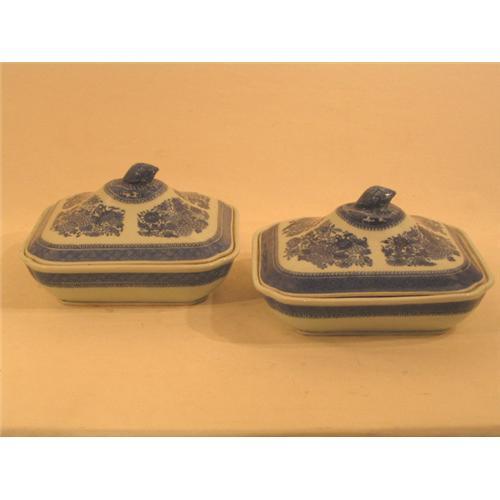 Hard to find pair of Blue patterned Fitz Hugh covered vegetable dishes. Blue is more difficult to locate - to find a pair makes this an enticing offer. Traditional Fitzhugh patterned decoration and in a traditional form. Very good condition with no rim chips or abrasions. No restoration. Wear consistent with age. c. 1790. Each dish measures 9 3/4" by 8 1/2" by 6" high to top of cover.