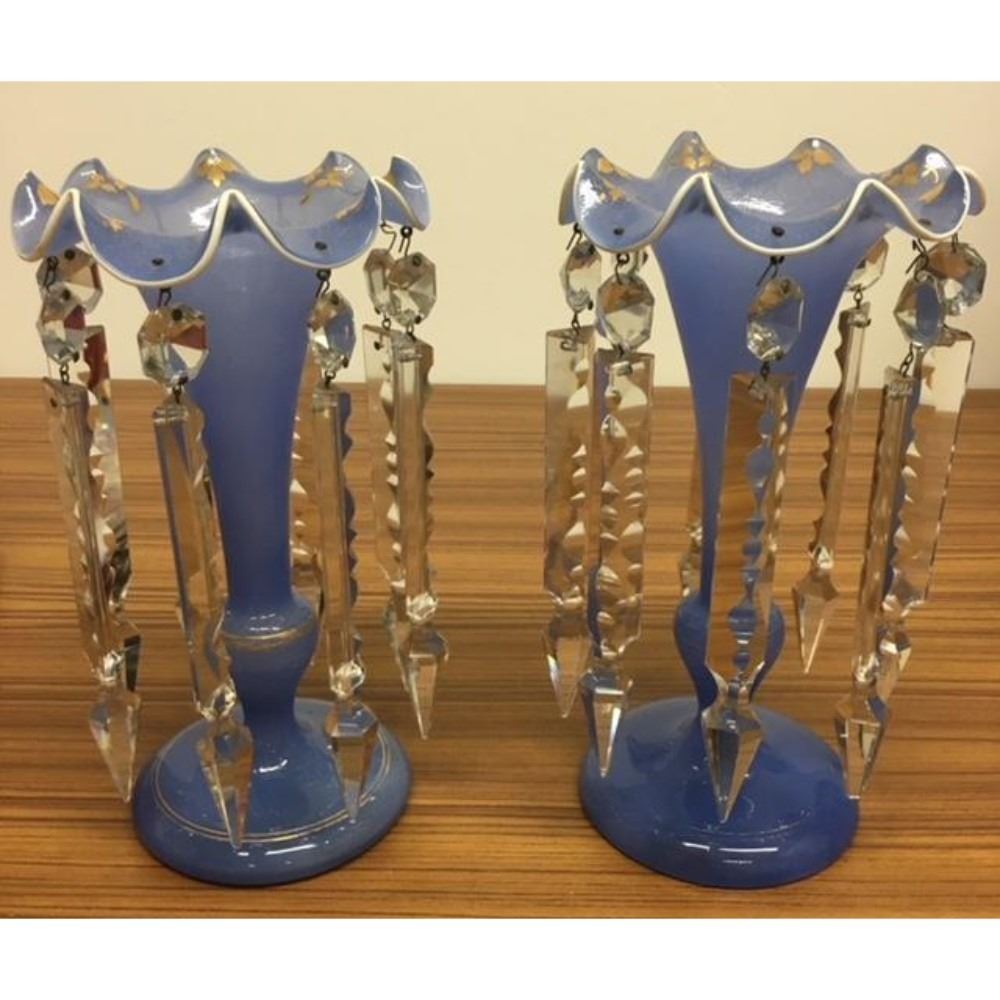 Two Blue Glass Lustre's With Crystal Icicle Prisms, Good Condition, minor age ware. 5x5x9.5" (WxDxL).