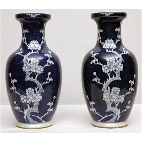 A pair of blue and white Chinese vases with pear blossom design on front. Chop marks on the bottom. 14.5" tall, 6.5" wide, 4.5" top and bottom diameter. Late 20th C.