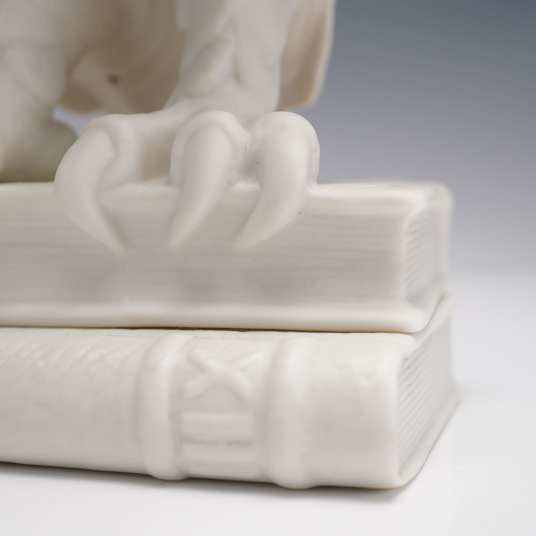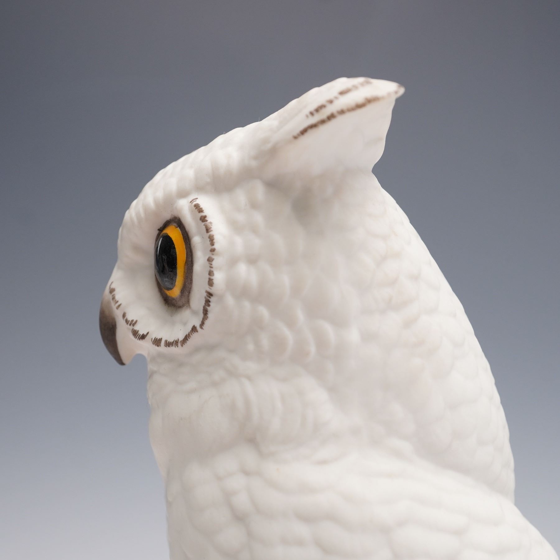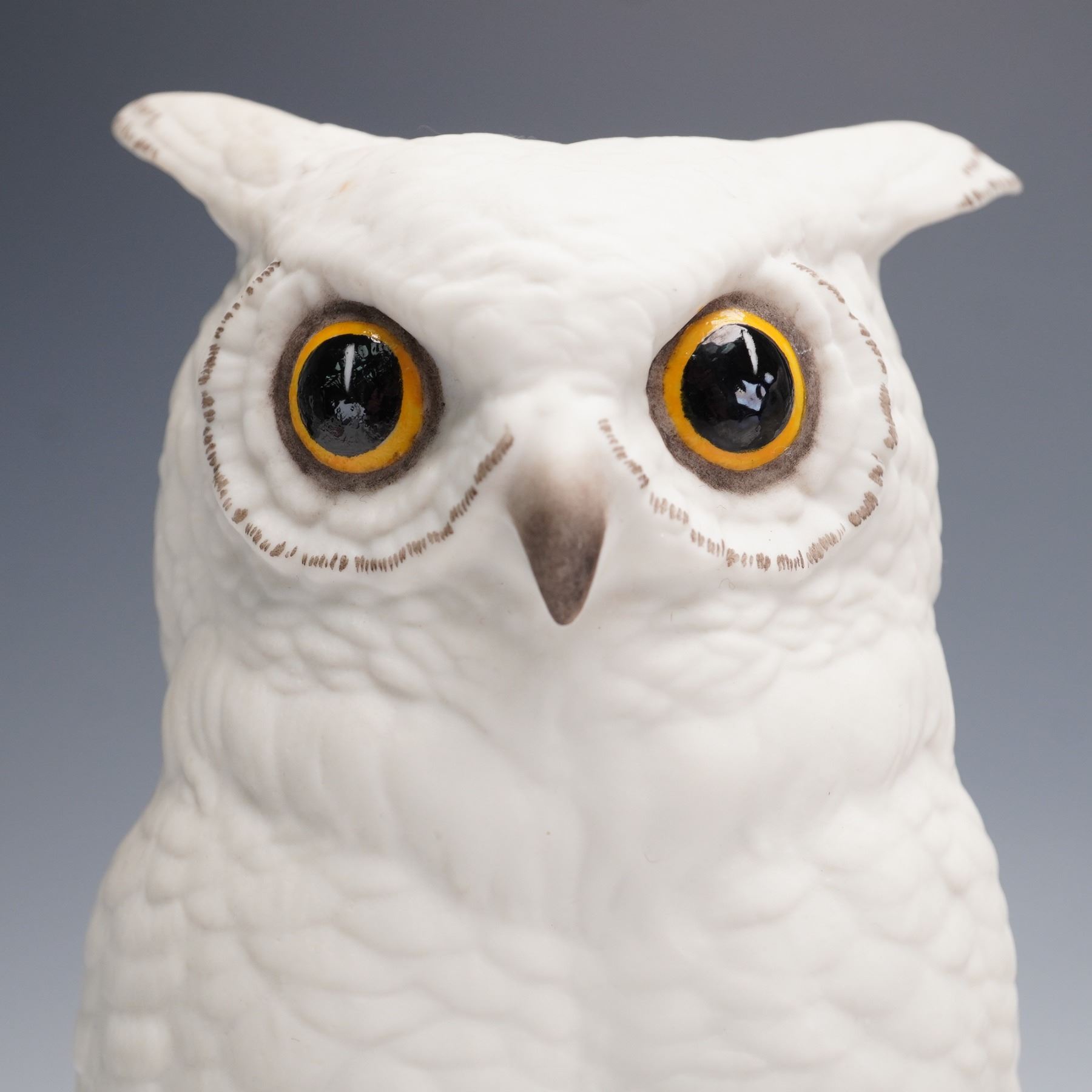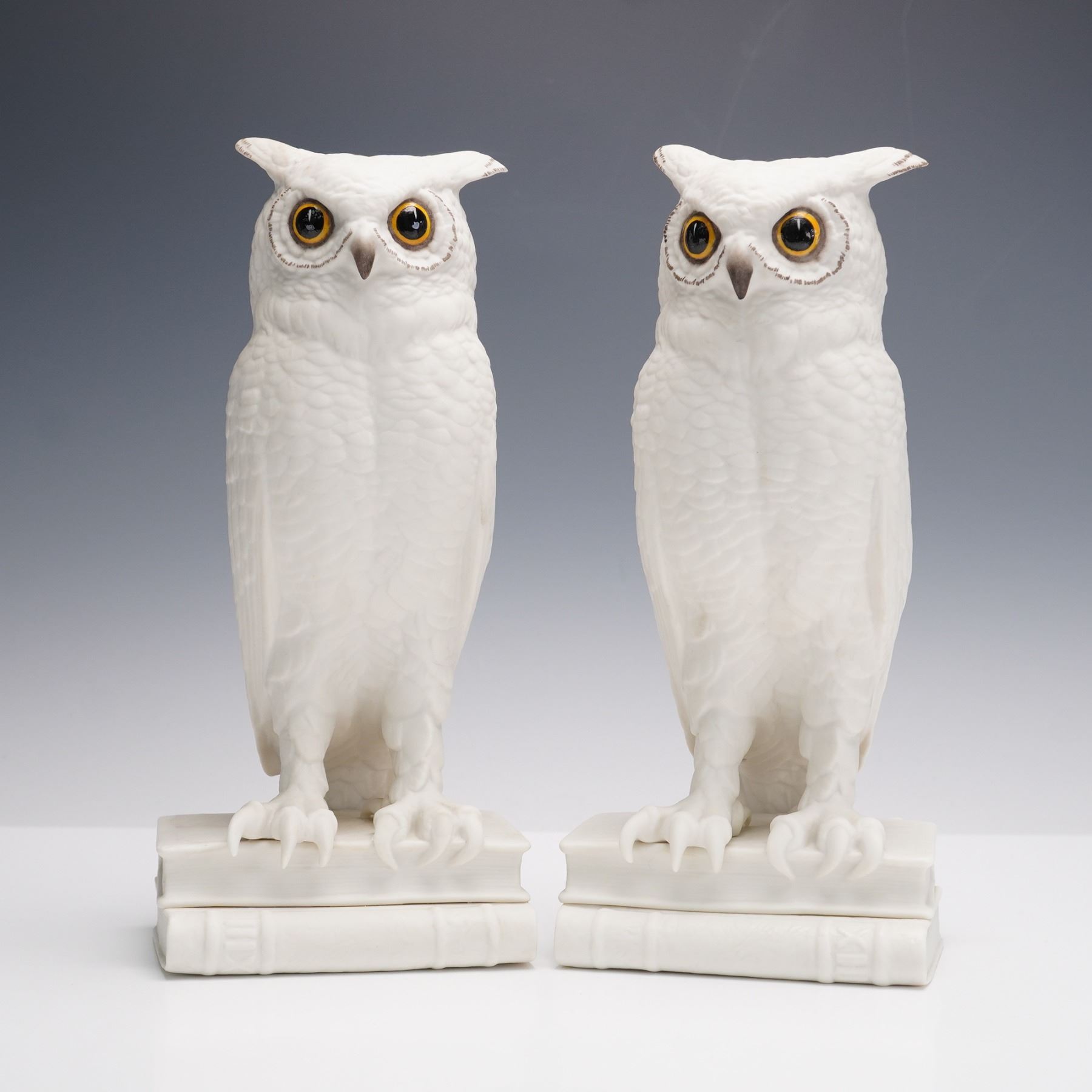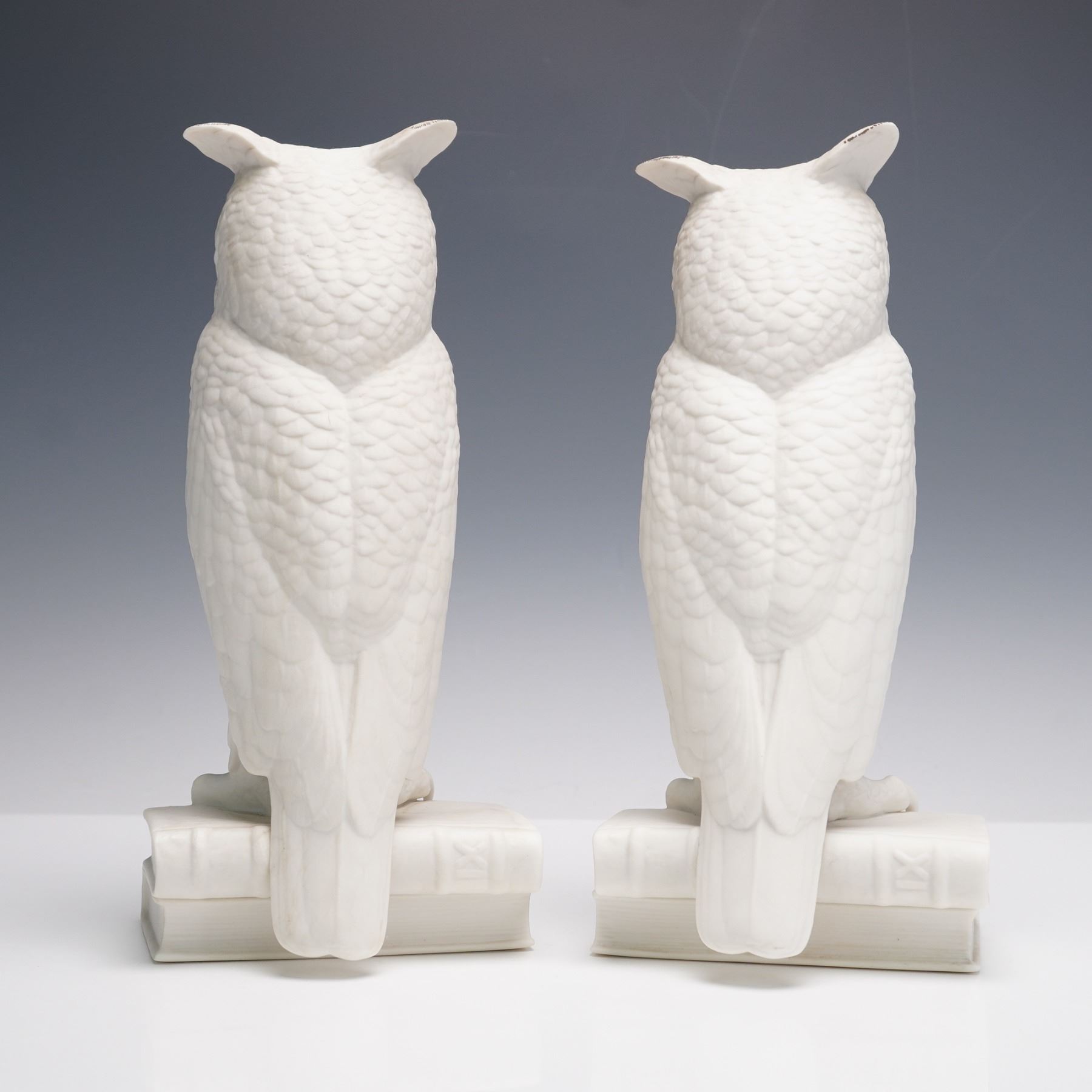 A pair of Boehm porcelain bookends featuring finely modeled owls perched on stacked books. Executed in a clean white finish with hand-painted glassy eyes, the owls are detailed with textured feathers and naturalistic talons resting on the volumes. Each piece is marked on the underside with the Boehm backstamp.