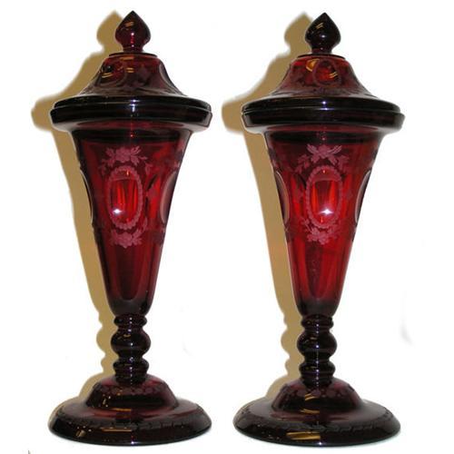 This magnificent pair of engraved Bohemian red covered vases date from the nineteenth century, and are in excellent condition with no visible cracks, chips or repairs. There is some adhesive residue on the top of the base of one goblet. Each measures 14" high and 5.5" across and weighs 3 lbs.